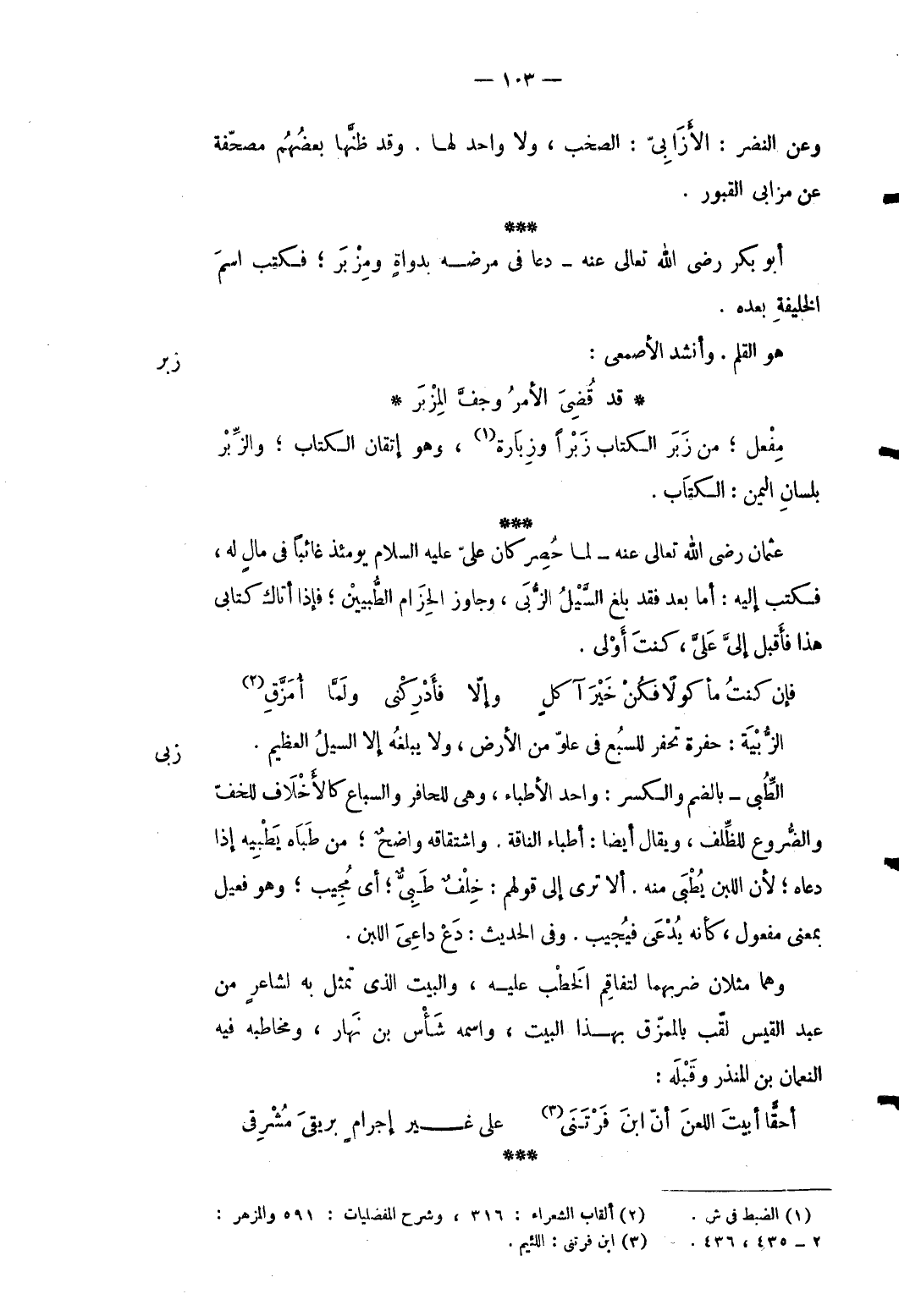 3 - وَعَن النَّضر: الأزابي: الصخب وَلَا وَاحِد لَهَا. وَقد ظَنّهَا بَعضهم مصحفة عَن مزابي الْقُبُور. أَبُو بكر رَضِي الله تَعَالَى عَنهُ دَعَا فِي مَرضه بِدَوَاةٍ ومزبر فَكتب اسْم الْخَلِيفَة بعده.