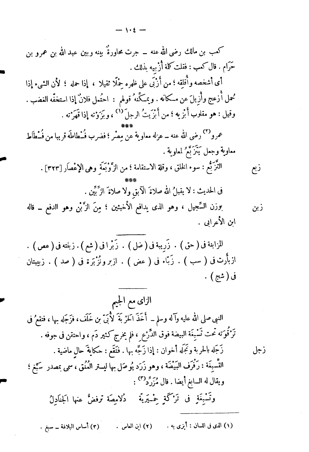 زبن بِوَزْن السجيل وَهُوَ الَّذِي يدافع الأخبثين من الزَّبْن وَهُوَ الدّفع قَالَه ابْن الْأَعرَابِي. الْمُزَابَنَة فِي (حق) . زريبة فِي (ضل) . زبرا فِي (شع) . زبنته فِي (عص) . ازبأرت فِي (سبّ) . زبّاء فِي (عض) . ازبر ونزبرة فِي (صد) . زَبِيبَتَانِ فِي (شج) .