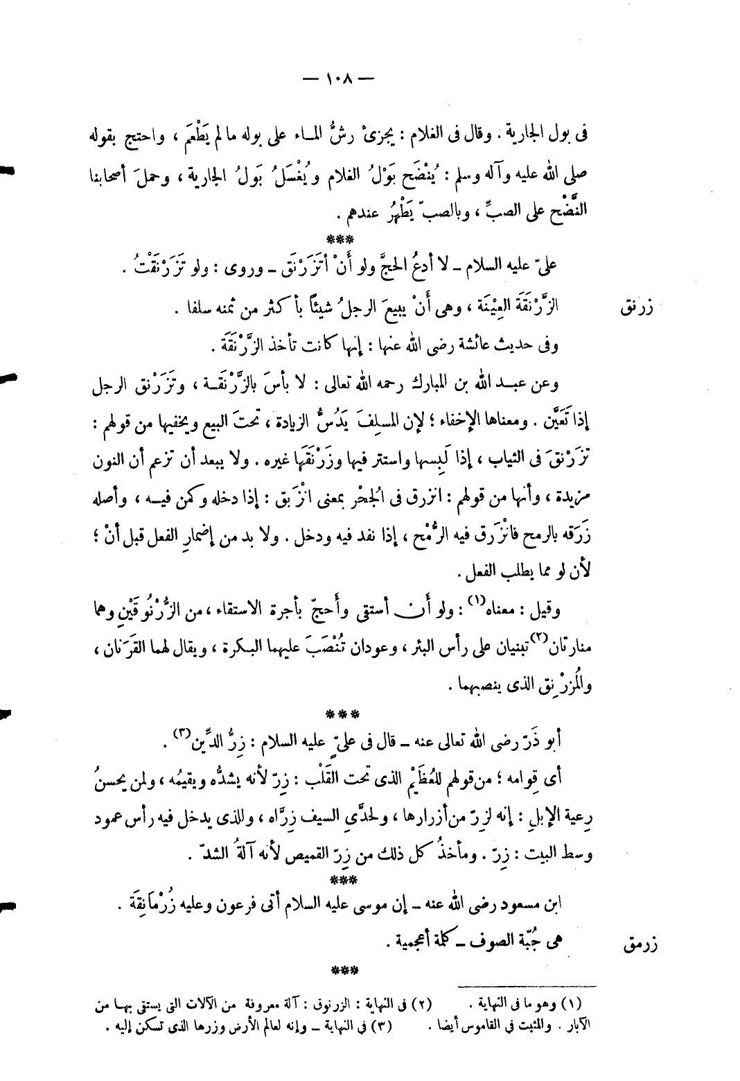 زرنق الزرنقة الْعينَة وَهِي أَن يَبِيع الرجل شَيْئا بِأَكْثَرَ من ثمنه سلفا. وَفِي حَدِيث عَائِشَة رَضِي الله عَنْهَا: إِنَّهَا كَانَت تَأْخُذ الزرنقة. وَعَن عبد الله بن الْمُبَارك رَحمَه الله تَعَالَى: لَا بَأْس بالزرنقة وتزرنق الرجل إِذا تعيَّن. وَمَعْنَاهَا الْإخْفَاء لإن المسلف يدس الزِّيَادَة تَحت البيع ويخفيها من قَوْلهم: تزرنق فِي الثِّيَاب إِذا لبسهَا واستتر فِيهَا وزرنقها غَيره. وَلَا يبعد أَن تزْعم أَن النُّون مزيدة وَأَنَّهَا من قَوْلهم: انزرق فى الْجُحر بمعى انزبق: إِذا دخله وَكَمن فِيهِ. وَأَصله زرقه بِالرُّمْحِ فانزرق فِيهِ الرمْح إِذا نفد فِيهِ وَدخل. وَلَا بُد من إِضْمَار الْفِعْل قبل أَن لِأَن لَو مِمَّا يطْلب الْفِعْل. وَقيل: مَعْنَاهُ: وَلَو أَن أستقي وأحج بِأُجْرَة الاستقاء من الزرنوقين وهما منارتان تبنيان على رَأس الْبِئْر وعودان تنصب عَلَيْهِمَا البكرة وَيُقَال لَهما القرنان والمزرنق الَّذِي ينصبهما. أَبُو ذَر رَضِي الله تَعَالَى عَنهُ قَالَ فِي عَليّ عَلَيْهِ السَّلَام: زر الدّين. أَي قوامه من قَوْلهم للعظيم الَّذِي تَحت الْقلب: زر لِأَنَّهُ يشده ويقيمه وَلمن يحسن رعية الْإِبِل: إِنَّه لزر من أزرارها ولحدي السَّيْف زراه وللذي يدْخل فِيهِ رَأس عَمُود وسط الْبَيْت: زر. ومأخذ كل ذَلِك من زر الْقَمِيص لِأَنَّهُ آلَة الشد. ابْن مَسْعُود رَضِي الله عَنهُ إِن مُوسَى عَلَيْهِ السَّلَام أَتَى فِرْعَوْن وَعَلِيهِ زرمانقة.
