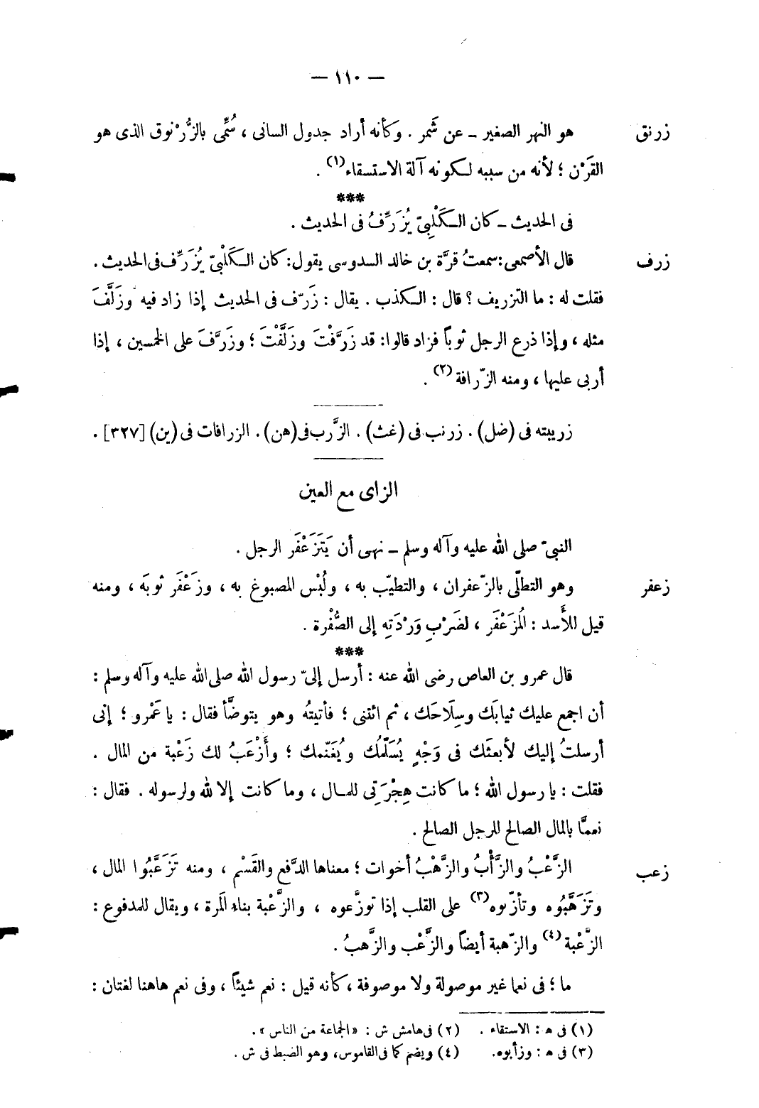 زعفر وَهُوَ التطلي بالزعفران والتطيب بِهِ وَلبس الْمَصْبُوغ بِهِ وزعفر ثَوْبه وَمِنْه قيل للأسد: المزعفر لضرب وردته إِلَى الصُّفْرَة. قَالَ عَمْرو بن الْعَاصِ رَضِي الله عَنهُ: أرسل إليّ رَسُول الله صلى الله عَلَيْهِ وَسلم: أَن اجْمَعْ عَلَيْك ثِيَابك وسلاحك ثمَّ ائْتِنِي فَأَتَيْته وَهُوَ يتَوَضَّأ فَقَالَ: يَا عَمْرو إِنِّي أرْسلت إِلَيْك لأبعثك فِي وَجه يسلمك ويغنمك وأزعب لَك زعبة من المَال. فَقلت: يَا رَسُول الله مَا كَانَت هجرتي لِلْمَالِ وَمَا كَانَت إِلَّا لله وَلِرَسُولِهِ. فَقَالَ: نعماًّ بِالْمَالِ الصَّالح للرجل الصَّالح.