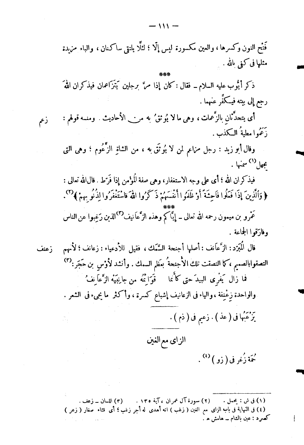 زعم أَي يتحدثان بالزَّعمات وَهِي مَا لَا يوثق بِهِ من الْأَحَادِيث وَمِنْه قَوْلهم: زَعَمُوا مَطِيَّة الْكَذِب. وَقَالَ أَبُو زيد: رجل مزاعم لمن لَا يوثق بِهِ من الشَّاة الزعوم وَهِي الَّتِي يجهل سمنها. فيذكران الله أَي على وَجه الاسْتِغْفَار وَهِي صفة الْمُؤمن إِذا فرّط. قَالَ الله تَعَالَى: {وَالَّذِينَ إذَا فَعَلُوا فَاحِشَةً أَوْ ظَلَمُوا أَنْفَسَهُمْ ذَكَرُوا اللهَ فاسْتَغْفَرُوا لِذُنُوبِهمْ} . عَمْرو بن مَيْمُون رَحمَه الله تَعَالَى إيَّاكُمْ وَهَذِه الزعانيف الَّذين رَغِبُوا عَن النَّاس وفارقوا الْجَمَاعَة.