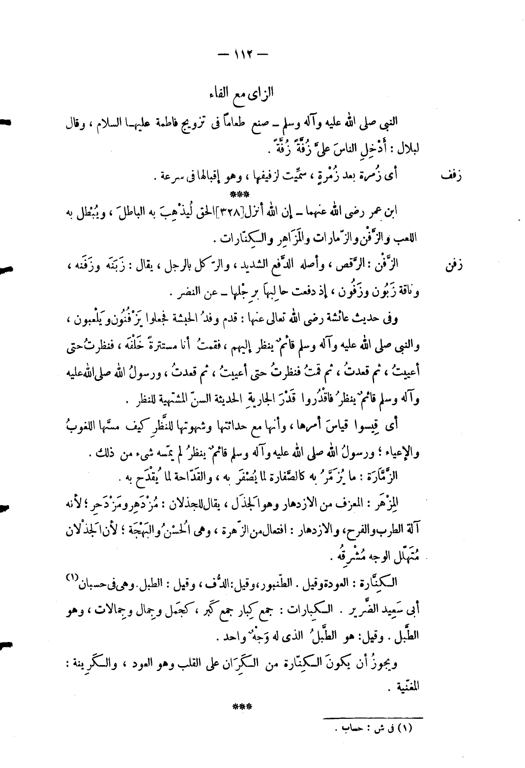 زفن الزَّفن: الرقص وَأَصله الدّفع الشَّديد والركل بِالرجلِ يُقَال: زبنة وزفنة وناقة زبون وزفون إِذْ دفعت حالبها برجلها عَن النَّضر. وَفِي حَدِيث عَائِشَة رَضِي الله تَعَالَى عَنْهَا: قدم وَفد الْحَبَشَة فَجعلُوا يزفنون ويلعبون وَالنَّبِيّ صلى الله عَلَيْهِ وَسلم قَائِم ينظر إِلَيْهِم فَقُمْت أَنا مستترة خَلفه فَنَظَرت حَتَّى أعييت ثمَّ قعدت ثمَّ قُمْت فَنَظَرت حَتَّى أعييت ثمَّ قعدت وَرَسُول الله صلى الله عَلَيْهِ وَسلم قَائِم ينظر فاقدروا قدر الْجَارِيَة الحديثة السن المشتهية للنَّظَر. أى قيسوا قِيَاس أمرهَا وَأَنَّهَا مَعَ حداثتها وشهوتها للنَّظَر كَيفَ مَسهَا اللغوب والإعياء رَسُول الله صلى الله عَلَيْهِ وَسلم قَائِم ينظر لم يمسهُ شَيْء من ذَلِك. الزَّمَّارة: مَا يزمَّر بِهِ كالصفَّارة لما يصفر بِهِ والقدّاحة لما يقْدَح بِهِ. المزهر: المعزف من الازدهار وَهُوَ الجذل يُقَال للجذلان: مزدهر ومزدحر لِأَنَّهُ آلَة الطَّرب والفرح ولازدهار: افتعال من الزهرة وَهِي الْحسن والبهجة لِأَن الجذلان متهلل الْوَجْه مشرقه. الكنَّارة: العودة وَقيل. الطنبور وَقيل: الدُّف وَقيل: الطبل وَهِي فِي حسبان أبي سعيد الضَّرِير. الكبارات: جمع كِبار جمع كَبر كجمل وجمال وجمالات وَهُوَ الطبل. وَقيل هُوَ الطبل الَّذِي لَهُ وَجه وَاحِد. وَيجوز أَن يكون الكنارة من الكران على الْقلب وَهُوَ الْعود والكرينة: الْمُغنيَة