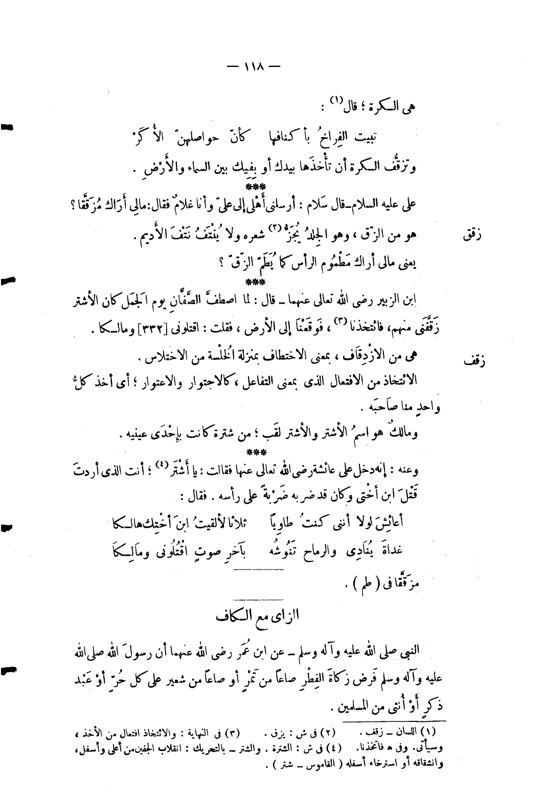 زقق هُوَ من الزق وَهُوَ الْجلد يجز شعره وَلَا ينتف نتف الْأَدِيم. يَعْنِي مَالِي أَرَاك مطموم الرَّأْس كَمَا يُطمّ الزق ابْن الزبير رَضِي الله تَعَالَى عَنْهُمَا قَالَ: لما اصطف الصفان يَوْم الْجمل كَانَ الأشتر زقفني مِنْهُم فائتخذنا فوقعنا إِلَى الأَرْض فَقلت: اقتلوني [332] ومالكا.