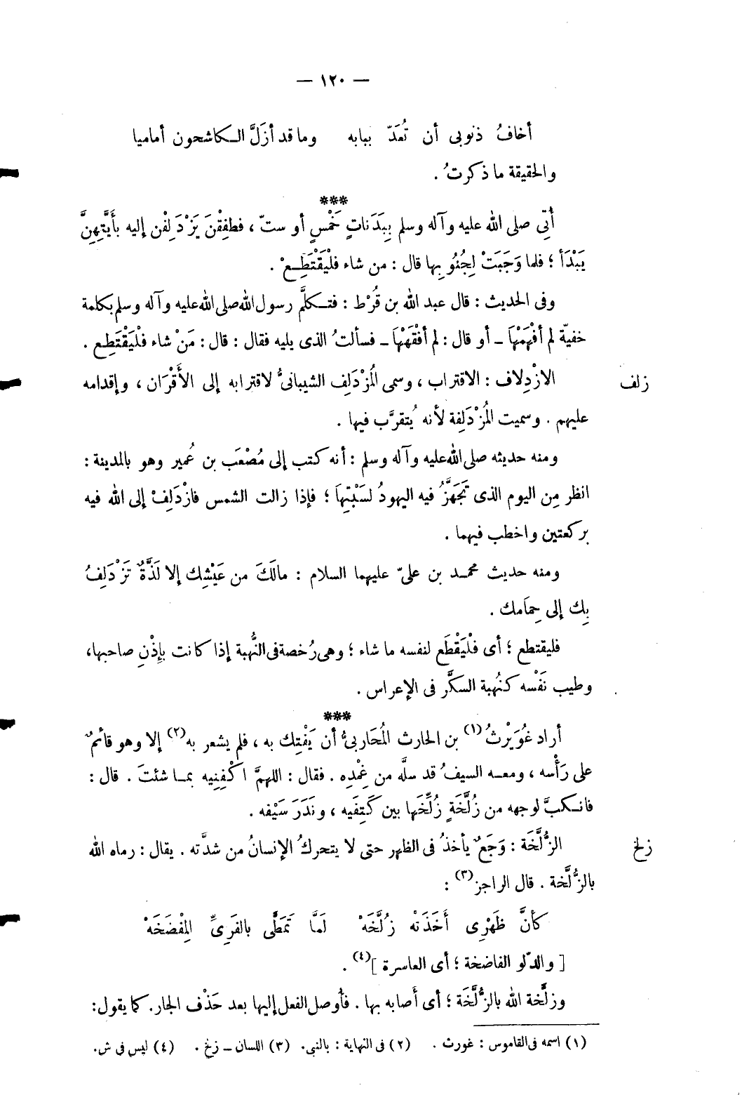 وَمِنْه حَدِيثه صلى الله عَلَيْهِ وَسلم: أَنه كتب إِلَى مُصعب بن عُمَيْر وَهُوَ بِالْمَدِينَةِ: انْظُر من الْيَوْم الَّذِي تجهز فِيهِ الْيَهُود لِسَبْتِهَا فَإِذا زَالَت الشَّمْس فازدلف إِلَى الله فِيهِ بِرَكْعَتَيْنِ واخطب فيهمَا وَمِنْه حَدِيث مُحَمَّد بنى عَليّ عَلَيْهِمَا السَّلَام: مَالك من عيشك إِلَّا لَذَّة تزدلف بك إِلَى حمامك. فليقتطع: أَي فليقطع لنَفسِهِ مَا شَاءَ وَهِي رخصَة فِي النهبة إِذا كَانَت بِإِذن صَاحبهَا وَطيب نَفسه كنهبة السكر فِي الإعراس. أَرَادَ غويرث بن الْحَارِث الْمحَاربي أَن يفتك بِهِ فَلم يشْعر بِهِ إِلَّا وَهُوَ قَائِم على رَأسه وَمَعَهُ السَّيْف قد سلَّه من غمده فَقَالَ: اللَّهُمَّ أكفنيه بِمَا شِئْت. قَالَ: فانكب لوجهه من زلخة زلخها بَين كَتفيهِ وندر سَيْفه.