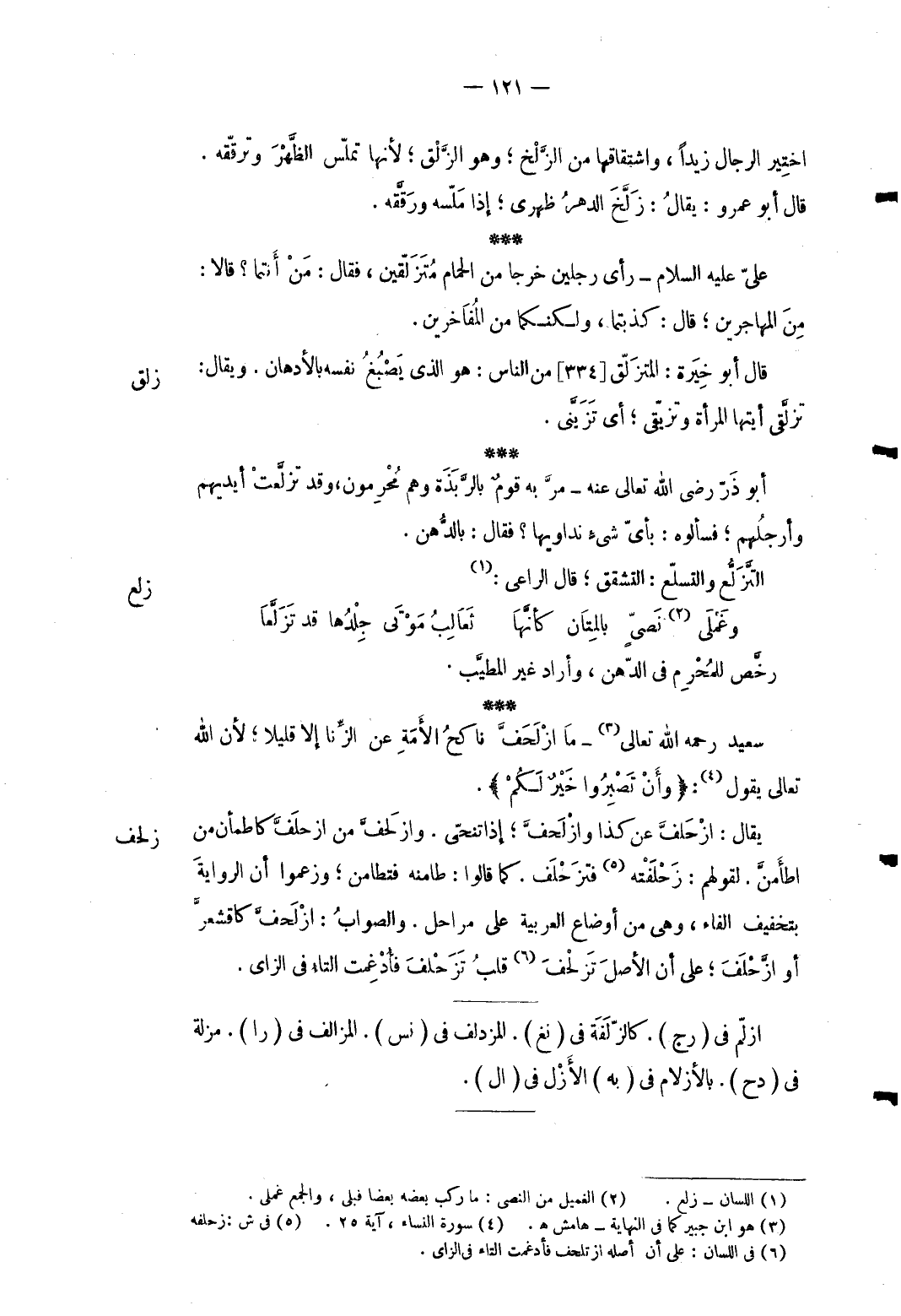 زلحف يُقَال: ازحلف عَن كَذَا وازلحف إِذْ تنحى. وازلحف من ازحلف كاطمأن من اطأمن. لقَولهم: زحلفته فتزحلف. كَمَا قَالُوا: طامنه فتطامن وَزَعَمُوا أَن الوراية بتَخْفِيف الْفَاء وَهِي من أوضاع الْعَرَبيَّة على مراحل وَالصَّوَاب: ازلحف كاقشعر أَو ازحلف على أَن الأَصْل تزلحف قلب تزحلف فأدغمت التَّاء فِي الزَّاي. ازلم فِي (رج) . كالزلفة فِي (نغ) . المزدلف فِي (نس) . المزالف فِي (را) . مزلة فِي (دح) . بالأزلام فِي (بِهِ) الْأَزَل فِي (ال) .