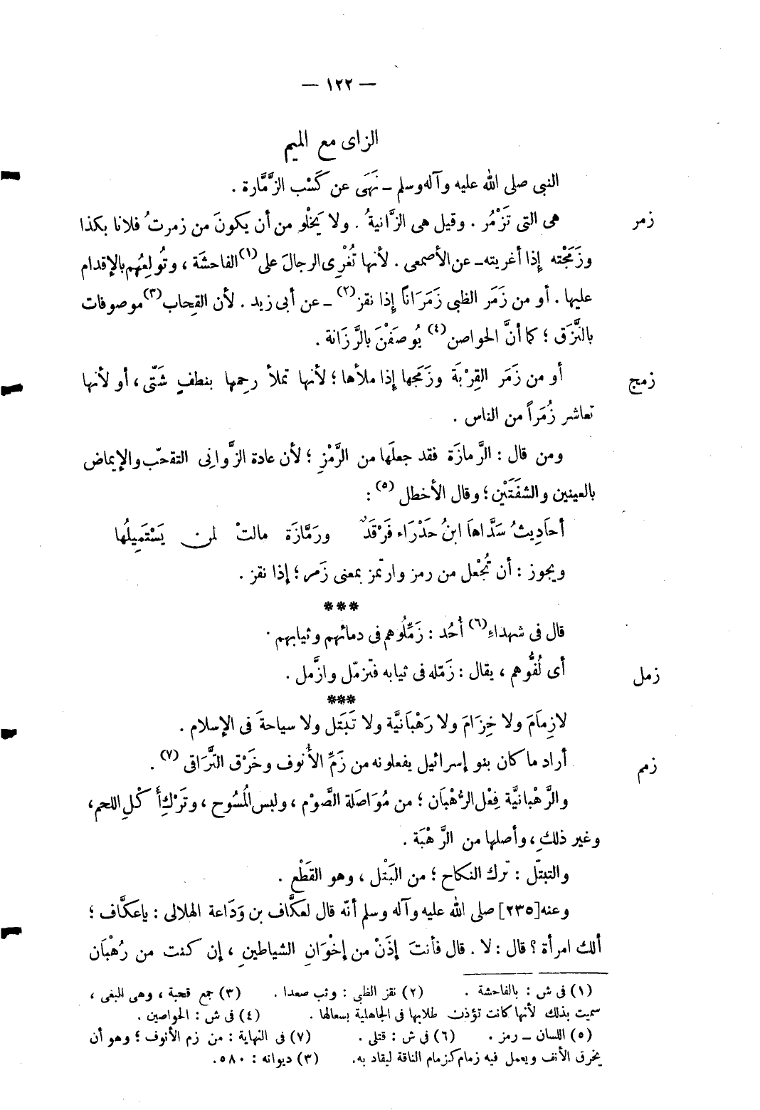 زمم أَرَادَ مَا كَانَ بَنو إِسْرَائِيل يَفْعَلُونَهُ من زمِّ الأُنوف وخرق التراقي (7) . والرهبانية فعل الرهبان من مُوَاصلَة الصَّوْم وَلبس المسوح وَترك أكل اللَّحْم وَغير ذَلِك وَأَصلهَا من الرهبة. والتبتل: ترك النِّكَاح من البتل وَهُوَ الْقطع. وَعنهُ [235] صلى الله عَلَيْهِ وَسلم أَنه قَالَ لِعَكَّافِ بن ودَاعَة الْهِلَالِي: يَا عَكَّاف أَلَك امْرَأَة قَالَ: لَا قَالَ فَأَنت إِذن من إخْوَان الشَّيَاطِين إِن كنت من رُهْبَان