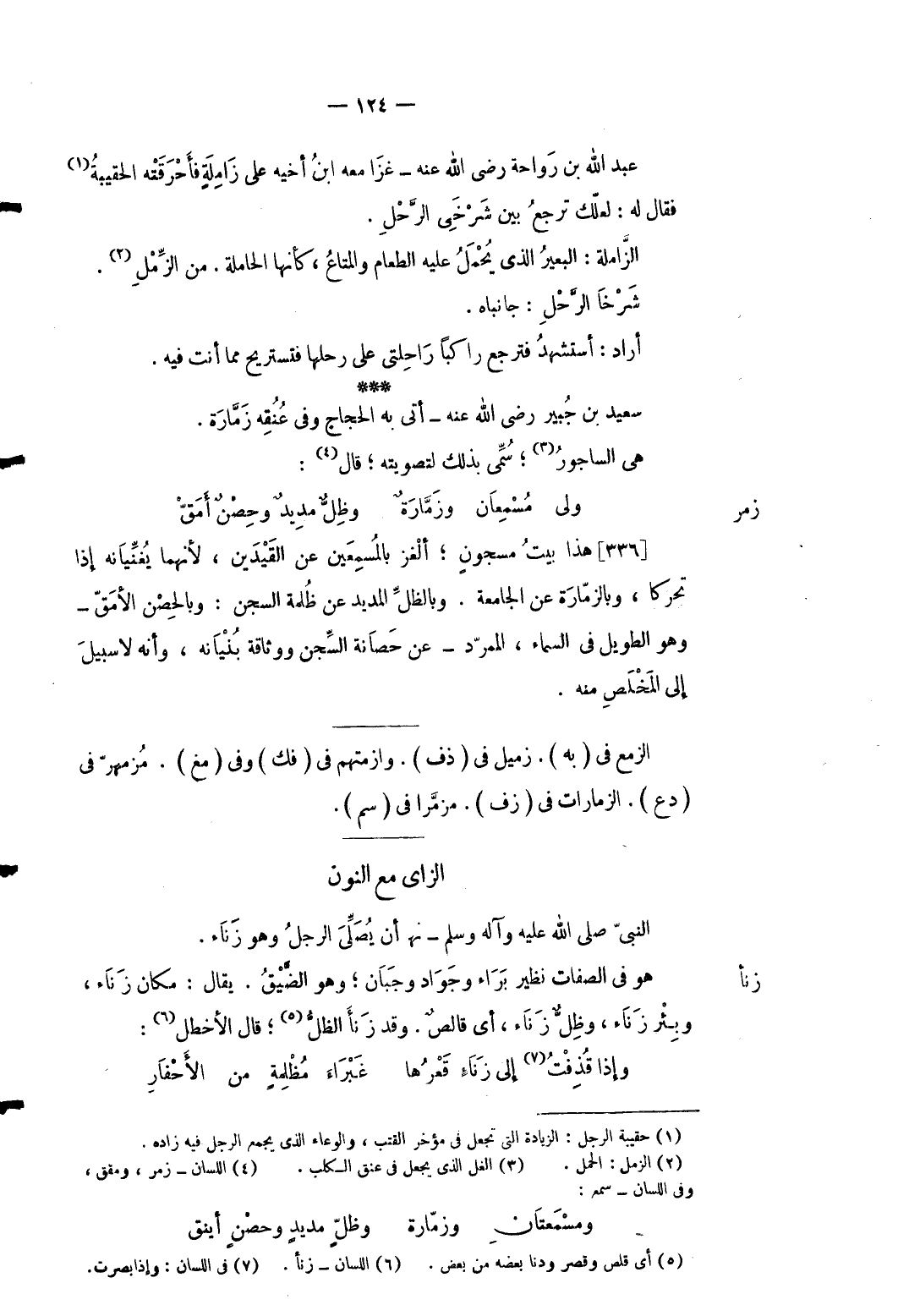 4 - عبد الله بن رَوَاحَة رَضِي الله عَنهُ غزا مَعَه ابْن أَخِيه على زاملة فَأَحْرَقتهُ الحقيبة فَقَالَ لَهُ: لَعَلَّك ترجع بَين شرخي الرحل. الزاملة: الْبَعِير الَّذِي يحمل عَلَيْهِ الطَّعَام وَالْمَتَاع كَأَنَّهَا الحاملة. من الزمل. شرخا الرحل: جانباه. أَرَادَ: اسْتشْهد فترجع رَاكِبًا رَاحِلَتي على رَحلهَا فتستريح مِمَّا أَنْت فِيهِ. سعيد بن جُبَير رَضِي الله عَنهُ أَتَى بِهِ الْحجَّاج وَفِي عُنُقه زمارة. هِيَ الساجور سمي بذلك لتصويته قَالَ: ... ولي مُسْمِعَان وزمارة ... وظل مديد وحصن أمق ...
