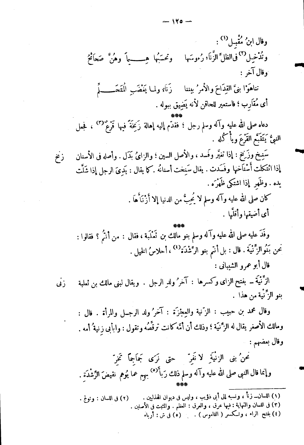 5 - وَقَالَ ابْن مقبل: ... وتُدْخِل فِي الظلِّ الزَّنَاءِ رُءوسَها ... وتحسَبُها هِيماً وهُنَّ صَحَائحُ ... وَقَالَ آخر: ... تناهَوْا بنيَّ القِدَاحَ والأمرُ بَيْننَا ... زَنَاءٌ وَلما يغْضب المتلم ... أَي مقارب فاستعير للحاقن لِأَنَّهُ يضيق ببوله. دَعَاهُ صلى الله عَلَيْهِ وَسلم رجل فَقدم إِلَيْهِ إهالة زنخة فِيهَا قرع فَجعل النبى يتتبع القرع وبأكله.