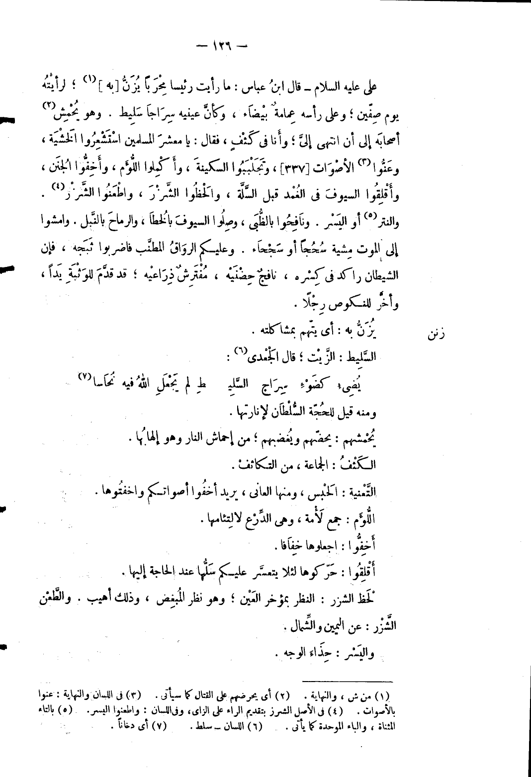 وَمِنْه قيل للحجة السُّلْطَان لإنارتها. يحمشهم: يحضهم ويغضبهم من إحماش النَّار وَهُوَ إلهابها. الكثف: الْجَمَاعَة من التكاثف. التعنية: الْحَبْس وَمِنْهَا العاني يُرِيد أخفوا أَصْوَاتكُم واخفتوها. اللؤم: جمع لأمة وَهِي الدرْع لالتئامها. أخفوا: اجْعَلُوهَا خفافا. أقلقوا: حركوها لِئَلَّا يتعسر عَلَيْكُم سلُّها عِنْد الْحَاجة إِلَيْهَا. لحظ الشزر: النّظر بمؤخر الْعين وَهُوَ نظر الْمُبْغض وَذَلِكَ أهيب. والطعن الشزر: عَن الْيَمين وَالشمَال. واليسر: حذاء الْوَجْه.