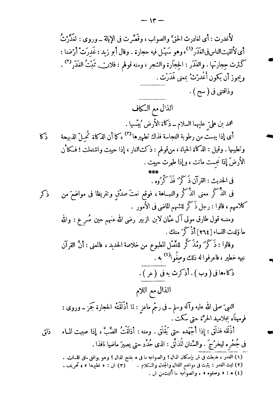 ذكر فِي الذّكر معنى الذِّكر والنباهة فَوَقع نعت صدق وتقريظا فِي مَوَاضِع من كَلَامهم قَالُوا: رجل ذكر للشهم الْمَاضِي فِي الْأُمُور. وَمِنْه قَول طَارق مولى آل عُثْمَان لِابْنِ الزبير رَضِي الله عَنْهُمَا حِين صرع وَالله مَا ولدت النِّسَاء [264] أذكر مِنْك. وَقَالُوا: ذكر ومذكر للنصل المطبوع من خُلَاصَة الْحَدِيد فَالْمَعْنى: أَن الْقُرْآن نبيه خطير فاعرفوا لَهُ ذَلِك وصفوا بِهِ. ذكاءها فِي (وب) . أذكرت بِهِ فِي (عر) .