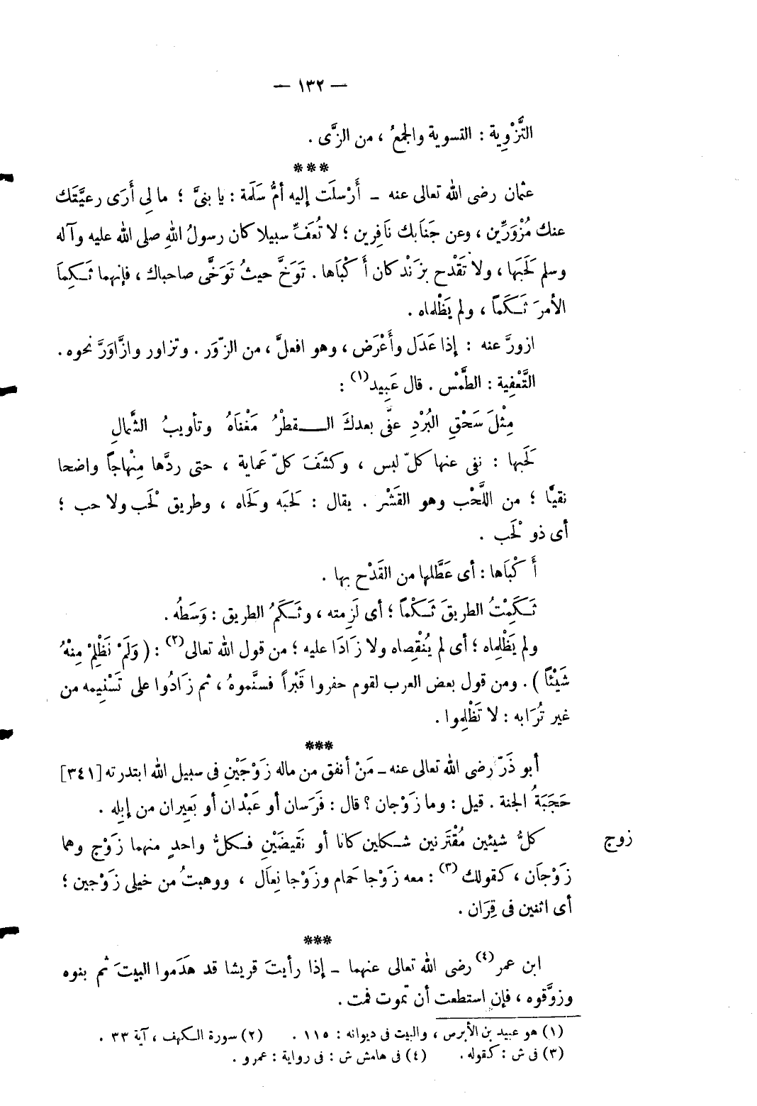 2 - التزوية: التَّسْوِيَة وَالْجمع من الزي. عُثْمَان رَضِي الله تَعَالَى عَنهُ أرْسلت إِلَيْهِ أم سَلمَة: يَا بنى مَا لى أرى رعيتك عَنْك مزورين وَعَن جنابك نافرين لَا تعف سَبِيلا كَانَ رَسُول الله صلى الله عَلَيْهِ وَسلم لَحَبَها وَلَا تقدح بزند كَانَ أكباها. توخ حَيْثُ توخى صاحباك فَإِنَّهُمَا ثكما الْأَمر ثكماً وَلم يظلماه. ازور عَنهُ: إِذا عدل وَأعْرض وَهُوَ افعلَّ من الزُّور. وتزاور وازَّاورَّ نَحوه التعفية: الطمس. قَالَ عبيد: ... مِثْلَ سَحْقِ البُرْدِ عفى بعدكَ القطْرُ ... مَغْنَاهُ وتأويبُ الشَّمالِ ... لحبها: نفى عَنْهَا كل لبس وكشف كل عماية حَتَّى ردهَا منهاجا وَاضحا نقيا من اللحب وَهُوَ القشر يُقَال: لحبه ولحاه وَطَرِيق لحب وَلَا حب أَي ذُو لحب. أكباها: أَي عطَّلها من الْقدح بهَا. ثكمت الطَّرِيق ثكماً أَي لَزِمته وثكم الطَّرِيق وَسطه. وَلم يظلماه أَي لم ينقصاه وَلَا زادا عَلَيْهِ من قَول الله تَعَالَى: {وَلَمْ تظلم مِنْهُ شَيْئاً} . وَمن قَول بعض الْعَرَب لقوم حفروا قبراً فسنموه ثمَّ زادوا على تسنيمه من غير ترابه: لَا تظلموا. أَبُو ذَر رَضِي الله تَعَالَى عَنهُ من أنْفق من مَاله زَوْجَيْنِ فِي سَبِيل الله ابتدرته [341] حجبة الْجنَّة. قيل: وَمَا زوجان قَالَ: فرسَان أَو عَبْدَانِ أَو بعيران من إبِله.