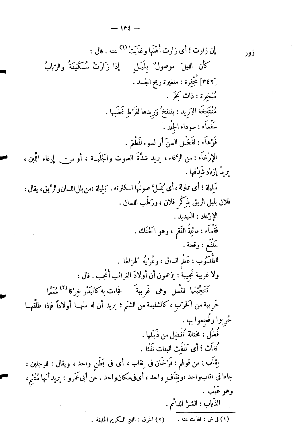 4 - زور إِن زارت أَي زارت أَهلهَا وَغَابَتْ عَنهُ قَالَ: ... كَأَن الليلَ موصولٌ بِلَيْلٍ ... إِذا زَارَتْ سُكَيْنَةُ والرّبابُ ... [342] مجفرة: متغيرة ريح الْجَسَد. مبخرة: ذَات بخر. منتفخة الوريد: ينتفخ وريدها لفرط غَضَبهَا. سفعاء: سَوْدَاء الْجلد. فوهاء: لقحل السن أَو لسوء الْمطعم. الإرغاء: من الرُّغاء يُرِيد شدَّة الصَّوْت والجلبة أَو من إرغاء اللَّبن يُرِيد إزباد شدقها. مليلة أَي مملولة أَي يمل صَوتهَا لكثرته. بليلة من بَلل اللِّسَان والريق يُقَال: فلَان بلبيل الرِّيق بِذكر فلَان وَرطب اللِّسَان. الإرعاد: التهديد. فقماء: مائلة الفقم وَهُوَ الحنك. سلفع: وقحة. الظنبوب: عظم السَّاق وعرية لهزالها. وَلَا غَرِيبَة نجيبة: يَزْعمُونَ أَن أَوْلَاد الغرائب أَنْجَب. قَالَ تَنَجَّبْتها للنسل وهى غَرِيبَة فَجَاءَت بِهِ كالبدر خرفا مُعَمَّما: حريبة من الْحَرْب كالشتيمة من الشتم يُرِيد أَن لَهُ مِنْهَا أَوْلَادًا فَإِذا طَلقهَا حربوا وفجعوا بهَا. فُضُل: مختالة تفضل من ذيلها. نفاث أَي تنفث الْبَنَات نفثا. نقاب: من قَوْلهم: فرخان فِي نقاب أَي فِي بطن وَاحِد وَيُقَال: للرجلين: جَاءَا فِي نقاب وَاحِد ونقاف وَاحِد أَي فِي مَكَان وَاحِد. عَن أبي عَمْرو: يُرِيد أَنَّهَا متئم وَهُوَ عيب. الذُّبَاب: الشَّرّ الدَّائِم.