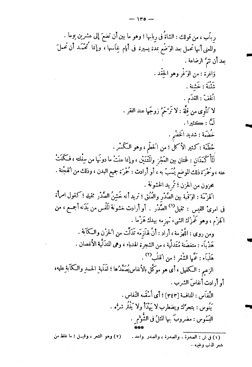 5 - ربَاب من قَوْلك: الشَّاة فِي ربابها وَهُوَ مَا بَين أَن تضع إِلَى عشْرين يَوْمًا. وَالْمعْنَى أَنَّهَا تحمل بعد الْوَضع بِمدَّة يسيرَة فِي أَيَّام نفَاسهَا وَإِنَّمَا تُحمد أَن تحمل بعد أَن تتمّ الرضَاعَة. واغرة: من الوغر وَهُوَ الحقد. شثنه: خشنة. الخفّ: الْقدَم. لَا تأوي من قلَّة: لَا ترحم زَوجهَا عِنْد الْفقر. لما: كثيرا. خضمة: شَدِيد الخضم. حُطمة: كثير الْأكل من الحطم وَهُوَ الْكسر. المأكمتان: لحمتان بَين الْعَجز والمتنين وَإِنَّمَا عنت مَا دونهَا من سفلته فَكنت عَنهُ وَحُمرَة ذَلِك الموض يسب بِهِ أَو أَرَادَت حمرَة جَمِيع الْبدن وَذَلِكَ من الهجنة. محزون من الْحزن تُرِيدُ الخشونة. الهزمة: الوقبة بَين الصَّدْر والعنق تُرِيدُ أَنه خشن الصَّدْر ثَقيلَة كَقَوْل امْرَأَة فِي امرىء الْقَيْس: ثقيل الصَّدْر. أَو أَرَادَت خشونة الملمس من بدنه أجمع من الهزم وَهُوَ غمزك الشَّيْء تهزمه بِيَدِك هزما. وَمن روى: اللهزمة أَرَادَ: أَن لَهَا زمة تدلَّت من الْحزن والكآبة. هدباء: متغضنة متدلية من الشَّجَرَة الهدباء وَهِي المتدلية الأغصان. هلباء: عمَّها الشّعْر من الهلب. الزعيم: الْكَفِيل أَي هُوَ مُوكل بالأنفاس يصعدها لغَلَبَة الْحَسَد والكآبة عَلَيْهِ أَو أَرَادَت أنفاس الشّرْب. النِّفاس: المنافسة [343] أَي أسقمه النّفاس. ينوس: يَتَحَرَّك ويضطرب لَا يهدأ وَلَا يفتر شرُّه. البسوس: مَضْرُوب بهَا الْمثل فِي الشؤْم.