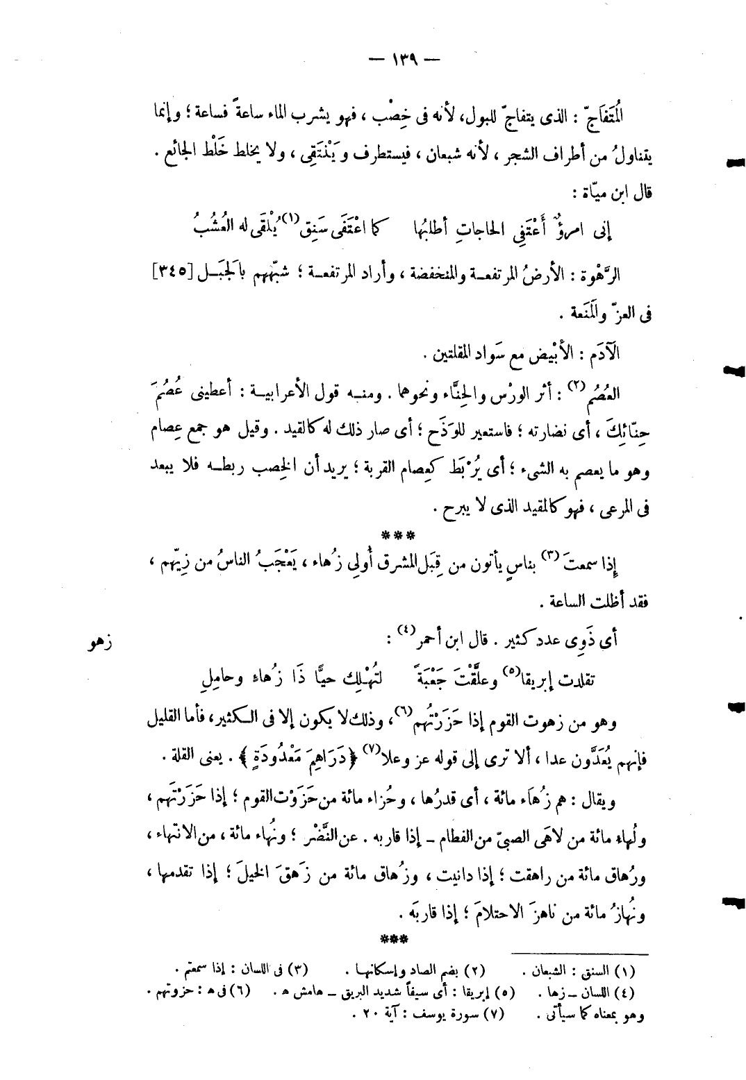 9 - المتفاج: الَّذِي يتفاج للبول لِأَنَّهُ فِي خصب فَهُوَ يشرب المَاء سَاعَة فساعة وَإِنَّمَا يتَنَاوَل من أَطْرَاف الشّجر لِأَنَّهُ شبعان فيستطرف وينتقي وَلَا يخلط خلط الجائع. قَالَ ابْن ميّاة: ... إِنِّي امرؤٌ أَعْتَفِي الحاجاتِ أطلبُها ... كَمَا اعْتَفَي سَنِق يُلْقَي لَهُ العُشُبُ ... الرهوة: الأَرْض المرتفعة والمنخفضة وَأَرَادَ المرتفعة شبههم بِالْجَبَلِ [245] فِي الْعِزّ والمنعة. الآدم: الْأَبْيَض مَعَ سَواد المقلتين. العصم: أثر الورس والحناء وَنَحْوهمَا. وَمِنْه قَول الأعرابية: أعطيني عُصم حنائك أَي نضارته فاستعير للوذح أَي صَار ذَلِك لَهُ كالقيد. وَقيل هُوَ جمع عِصَام وَهُوَ مَا يعْصم بِهِ الشَّيْء أَي يرْبط كعصام الْقرْبَة يُرِيد أَن الخصب ربطه فَلَا يبعد فِي المرعى فَهُوَ كالمقيد الَّذِي لَا يبرح. إِذا سَمِعت بناسٍ يأْتونَ من قبل الْمشرق أولى زهاء يعجب النَّاس من زيهم فقد أظلت السَّاعَة.