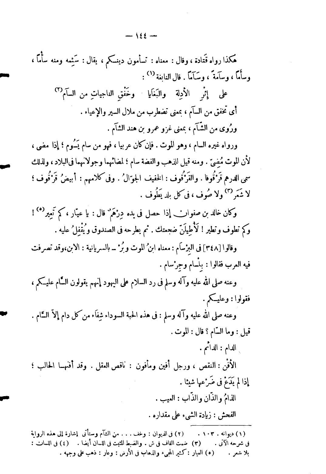 4 - هَكَذَا رَوَاهُ قَتَادَة وَقَالَ: مَعْنَاهُ: تسامون دينكُمْ يُقَال: سئمه وَمِنْه سأما وسأما وسآمةً وسَآماً. قَالَ النَّابِغَة: ... على إِثْر الأدِِلة والبغاَيا ... وخَفقِ الناجياتِ من السآم ... أَي تخفق من السآم بِمَعْنى تضطرب من ملال السّير والإعياء. وروى من الشآم بِمَعْنى غَزْو عَمْرو بن هِنْد الشآم. وَرَوَاهُ غَيره السام وَهُوَ الْمَوْت. فَإِن كَانَ عَرَبيا فَهُوَ من سَام يسوم إِذا مضى لِأَن الْمَوْت مضى. وَمِنْه قيل لِلذَّهَبِ وَالْفِضَّة سَام لمضائهما وجولانهما فِي الْبِلَاد وَلذَلِك سمي الدِّرْهَم قرقوفا والقرقوف: الْخَفِيف الجوال. وفى كَلَامهم: أَبيض قرقوف لَا شعر وَلَا صوف فِي كل بلد يطوف. وَكَانَ خَالِد بن صَفْوَان إِذا حصل فِي يَده دِرْهَم قَالَ: يَا عيار كم تعير وَكم تَطوف وَتَطير لأطيلن ضجعتك. ثمَّ يطرحه فِي الصندوق ويقفل عَلَيْهِ. وَقَالُوا [348] فِي البرسام: مَعْنَاهُ ابْن الْمَوْت وبر بالسُّرْيَانيَّة: الابْن وَقد تصرفت فِيهِ الْعَرَب فَقَالُوا: بلسام وجرسام. وَعنهُ صلى الله عَلَيْهِ وَسلم فِي رد السَّلَام على الْيَهُود إِنَّهُم يَقُولُونَ السام عَلَيْكُم فَقولُوا: وَعَلَيْكُم. وَعنهُ صلى الله عَلَيْهِ وَسلم: فى هَذِه الْحبَّة السوادء شِفَاء من كل دَامَ إِلَّا السام. قيل: وَمَا السام قَالَ: الْمَوْت. الدام: الدَّائِم. الأفن: النَّقْص وَرجل أفين ومأفون: نَاقص الْعقل. وَقد أفنها الحالب إِذا لم يدع فِي ضرْعهَا شَيْئا. الذام والذان والذاب: الْعَيْب. الْفُحْش: زِيَادَة الشىء على مقاداره.