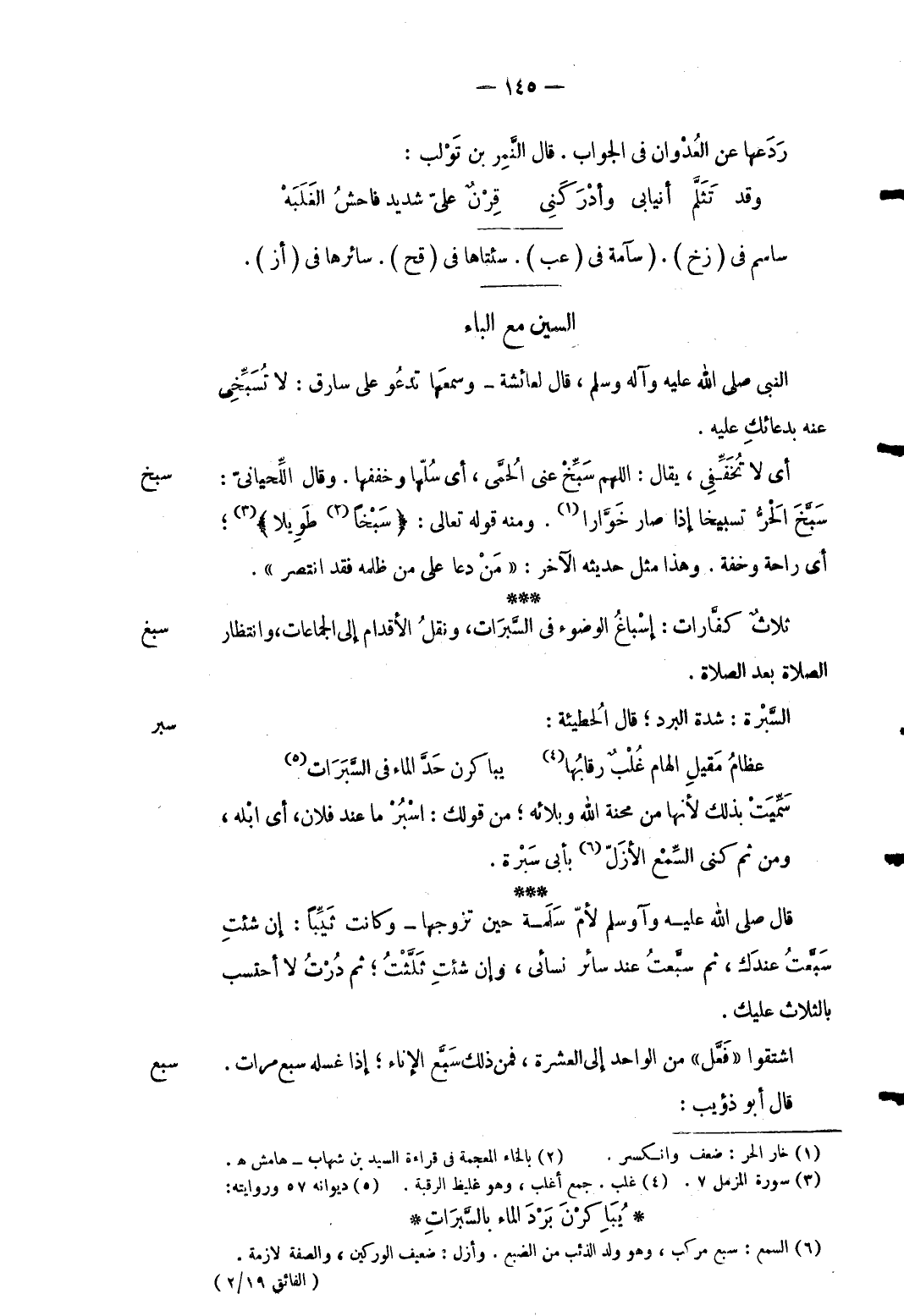 سبر السبرة: شدَّة الْبرد قَالَ الحطيئة: ... عظامُ مَقيلِ الْهَام غُلْبٌ رقابُها ... يباكرن حَدَّ المَاء فِي السَّبَرَات ... سميت بذلك لِأَنَّهَا من محنة الله وبلائه من قَوْلك: اسبر مَا عِنْد فلَان أَي ابله وَمن ثمَّ كنى السّمع الْأَزَل بأبى سُبْرَة. قَالَ صلى الله عَلَيْهِ وَسلم لأم سَلمَة حِين تزَوجهَا وَكَانَت ثَيِّبًا: إِن شِئْت سبَّعت عنْدك ثمَّ سبَّعت عِنْد سَائِر نسَائِي وَإِن شِئْت ثلثت ثمَّ درت لَا أحتسب بِالثلَاثِ عَلَيْك.