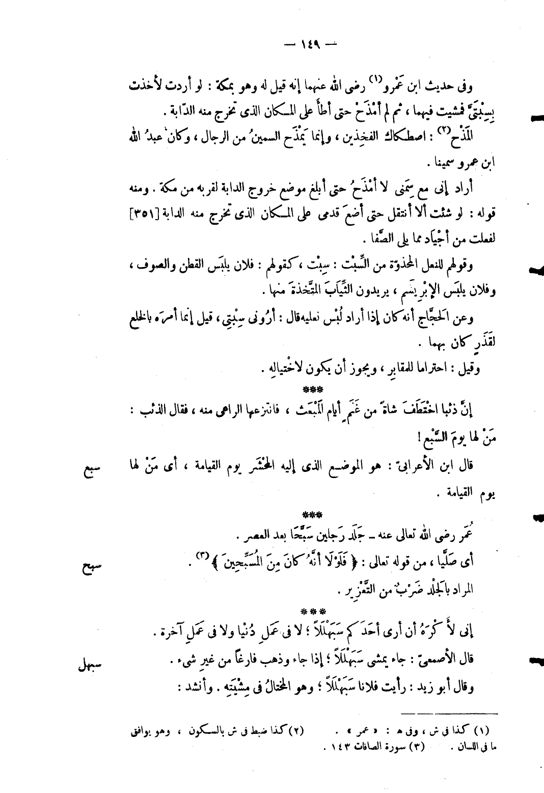 سبح أَي صليا من قَوْله تَعَالَى: {فَلَوْلاَ أنَّهُ كانَ مِنَ المُسَبِّحِينَ} المُرَاد بِالْجلدِ ضرب من التعزيز. إِنِّي لأكْره أَن أرى أحدكُم سَبَهْلَلا لَا فِي عمل دنيا وَلَا فِي عمل آخِرَة قَالَ الْأَصْمَعِي: جَاءَ يمشي سَبَهْلَلا إِذا جَاءَ وَذهب فَارغًا من غير شَيْء. وَقَالَ أَبُو زيد: رَأَيْت فلَانا سَبَهْلَلا وَهُوَ المختال فِي مشيته. وَأنْشد: