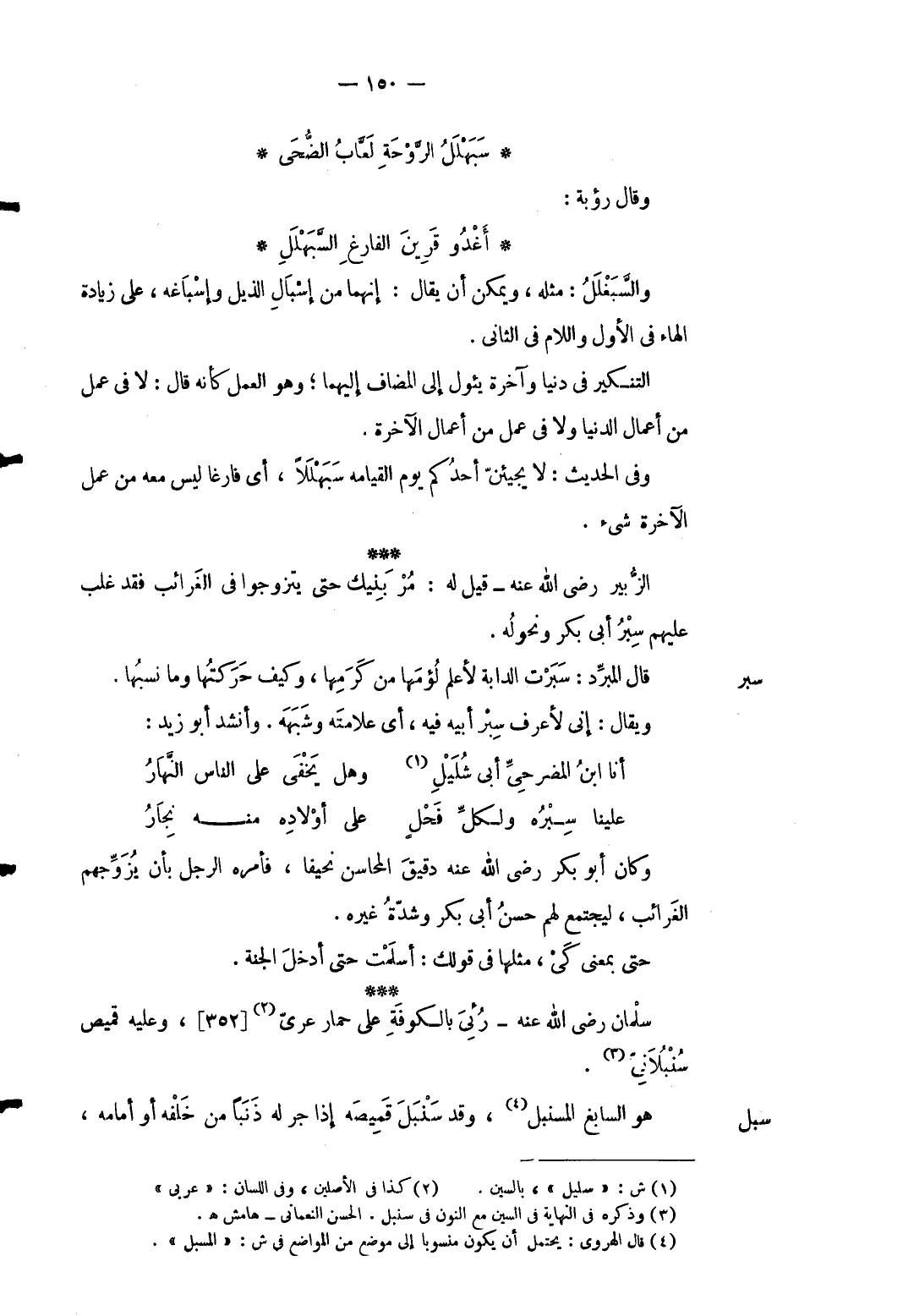 علينا سِبْرُه ولكلِّ فَحْلٍ ... على أوْلادِه مِنْهُ نِجَارُ ... وَكَانَ أَبُو بكر رَضِي الله عَنهُ دَقِيق المحاسن نحيفا فَأمره الرجل بِأَن يزوجهم الغرائب ليجتمع لَهُم حسن أبي بكر وَشدَّة غَيره. حَتَّى بِمَعْنى كي مثلهَا فِي قَوْلك: أسلمت حَتَّى أَدخل الْجنَّة. سلمَان رَضِي الله عَنهُ رئي بِالْكُوفَةِ على حمَار عرى [352] وَعَلِيهِ قَمِيص سنبلانى.