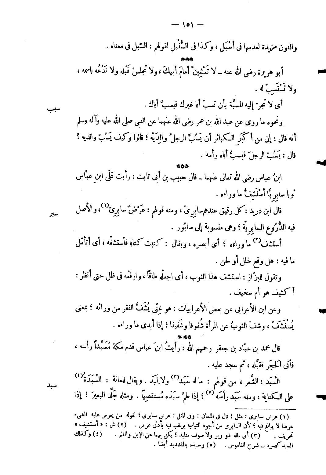 1 - وَالنُّون مزيدة لعدمها فِي أسبل وَكَذَا فِي السنبل لقَولهم: السبل فِي مَعْنَاهُ. أَبُو هُرَيْرَة رَضِي الله عَنهُ لَا تمشين أَمَام أَبِيك وَلَا تجْلِس قبله وَلَا تَدعه باسمه وَلَا تستسب لَهُ.