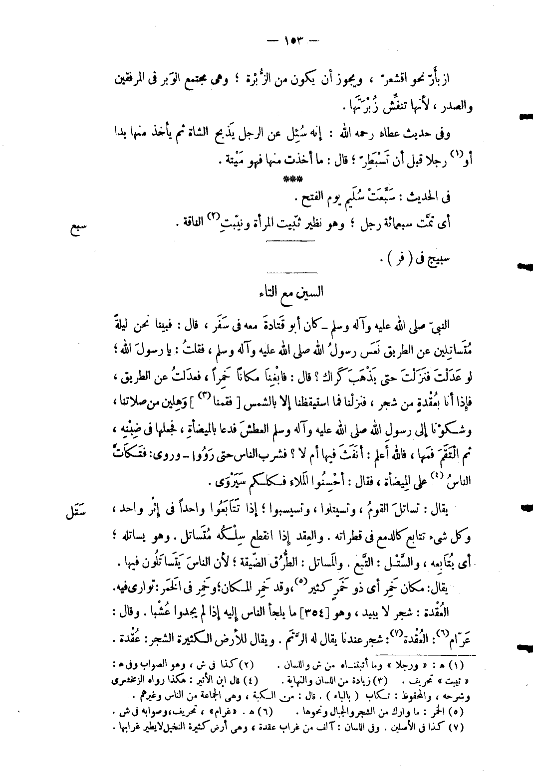 3 - ازبأر نَحْو اقشعر وَيجوز أَن يكون من الزبرة وَهِي مُجْتَمع الْوَبر فِي الْمرْفقين والصدر لِأَنَّهَا تنفش زبرتها. وَفِي حَدِيث عَطاء رَحمَه الله: إِنَّه سُئل عَن الرجل يذبح الشَّاة ثمَّ يَأْخُذ مِنْهَا يدا أَو رجلا قبل أَن تسبطر قَالَ: مَا أخذت مِنْهَا فَهُوَ ميتَة. فى الحَدِيث: شبعت سليم يَوْم الْفَتْح.