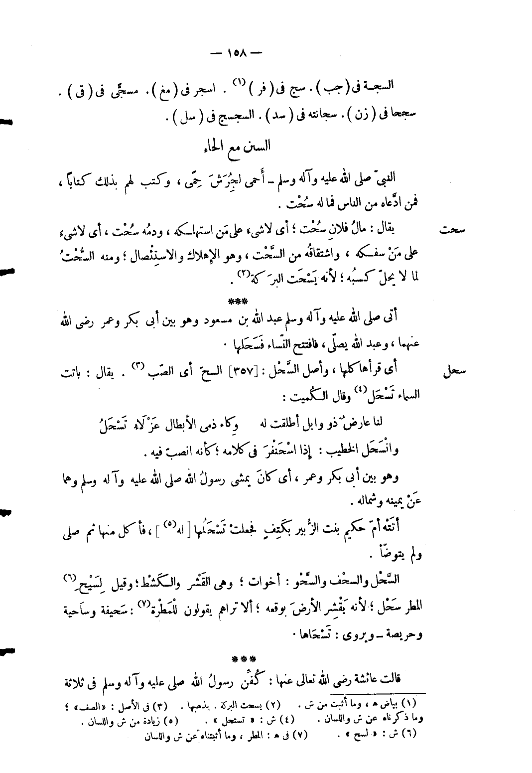 8 - السجة فِي (جب) . سج فِي (فر) . اسجر فى (مغ) . مسجى فى (قي) سجحا فِي (زن) . سجانته فِي (سد) . السجسج فى (سل) .