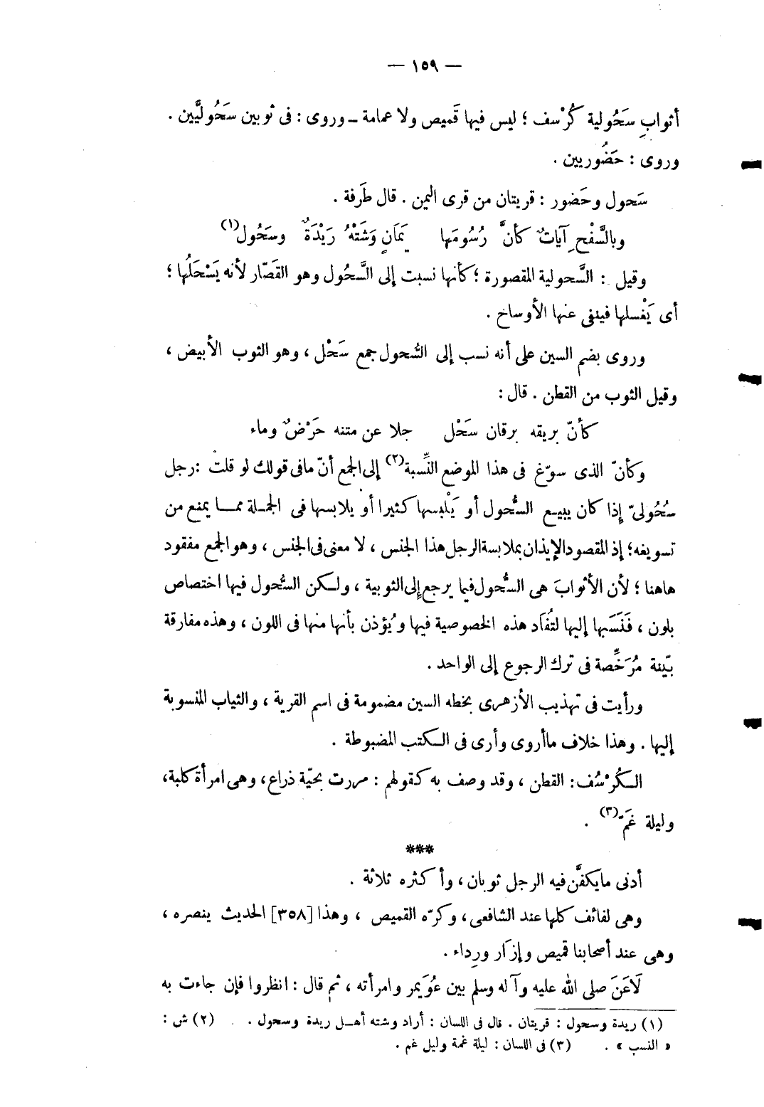 9 - أَثوَاب سحُولِيَّة كُرْسُف لَيْسَ فِيهَا قَمِيص وَلَا عِمَامَة وَرُوِيَ: فِي ثَوْبَيْنِ سَحُولِيَّيْنِ وَرُوِيَ: حضوريين. سحول وَحُضُور: قَرْيَتَانِ من قرى الْيمن. قَالَ طرفَة. ... وبالسَّفْحِِ آياتٌ كأنَّ رُسُومَها ... يَمَانٍ وَشَتْهُ رَيْدَةٌ وسَحُول ... وَقيل: السحولية الْمَقْصُورَة كَأَنَّهَا نسبت إِلَى السحول وَهُوَ الْقصار لِأَنَّهُ يسحلها أَي يغسلهَا فينفي عَنْهَا الأوساخ. وروى بِضَم السِّين على أَنه نسب إِلَى السحول جمع سحل وَهُوَ الثَّوْب الْأَبْيَض وَقيل الثَّوْب من الْقطن. قَالَ: ... كأنّ بريقه برْقَان سحل ... جلا عَن مَتنه حَرضٌ وَمَاء ... وَكَأن الَّذِي سوغ فِي هَذَا الْموضع النِّسْبَة إِلَى الْجمع أَن مَا فِي قَوْلك لَو قلت: رجل سحولى إِذا كَانَ يَبِيع السحول أَو يلبسهَا كثيرا أَو يلابسها فِي الْجُمْلَة مِمَّا يمْنَع من تسويغه إِذْ الْمَقْصُود الإيذان بملابسة الرجل هَذَا الْجِنْس لَا معنى فِي الْجِنْس وَهُوَ الْجمع مَفْقُود هَاهُنَا لِأَن الأثواب هِيَ السحول فِيمَا يرجع إِلَى الثوبية وَلَكِن السحول فِيهَا اخْتِصَاص بلون فنسبها إِلَيْهَا لتفاد هَذِه الخصوصية فِيهَا وَيُؤذن بِأَنَّهَا مِنْهَا فِي اللَّوْن وَهَذِه مُفَارقَة بَيِّنَة مرخصة فِي ترك الرُّجُوع إِلَى الْوَاحِد. وَرَأَيْت فِي تَهْذِيب الأزهرى بخطة السِّين مضومة فِي اسْم الْقرْيَة وَالثيَاب المنسوبة إِلَيْهَا. وَهَذَا خلاف مَا أروى وَأرى فِي الْكتب المضبوطة. الكرسف: الْقطن وَقد وصف بِهِ كَقَوْلِهِم: مَرَرْت بحية ذِرَاع وَهِي امْرَأَة كلبة وَلَيْلَة غم. أدنى مَا يُكفن فِيهِ الرجل ثَوْبَان وَأَكْثَره ثَلَاثَة. وَهِي لفائف كلهَا عِنْد الشَّافِعِي وَكره الْقَمِيص وَهَذَا [358] الحَدِيث ينصره وَهِي عِنْد أَصْحَابنَا قَمِيص ة إِزَار ورداء. لَاعن صلى الله عَلَيْهِ وَسلم بَين عُوَيْمِر وَامْرَأَته ثمَّ قَالَ: انْظُرُوا فَإِن جَاءَت بِهِ