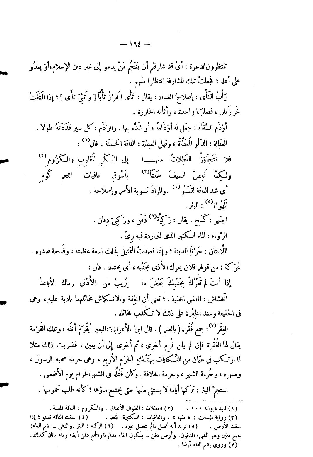 4 - تنتظرون الدعْوَة: أَي قد شارفتم أَن ينجم من يَدْعُو إِلَى غير دين الْإِسْلَام أَو يعدو على أَهله فَجعلت تِلْكَ المشارفة انتظارا مِنْهُم. رأب الثأي: إصْلَاح الْفساد يُقَال: ثأي الخرز ثأياً [وثئى ثأي] إِذا الْتَقت خرزتان فصارتا وَاحِدَة وأثأته الخارزة. أوذم السقاء: جعل لَهُ أوذاماً أَو شده بهَا. والوذم: كل سير قدرته طولا. العطلة: الدَّلْو المعطلة وَقيل العطلة: النَّاقة الْحَسَنَة. قَالَ: ... فَلَا نَتَجَاوَزُ العَطِلاتُ مِنْهَا ... إِلَى البَكْرِ المُقارِبِ والكَزُومِ