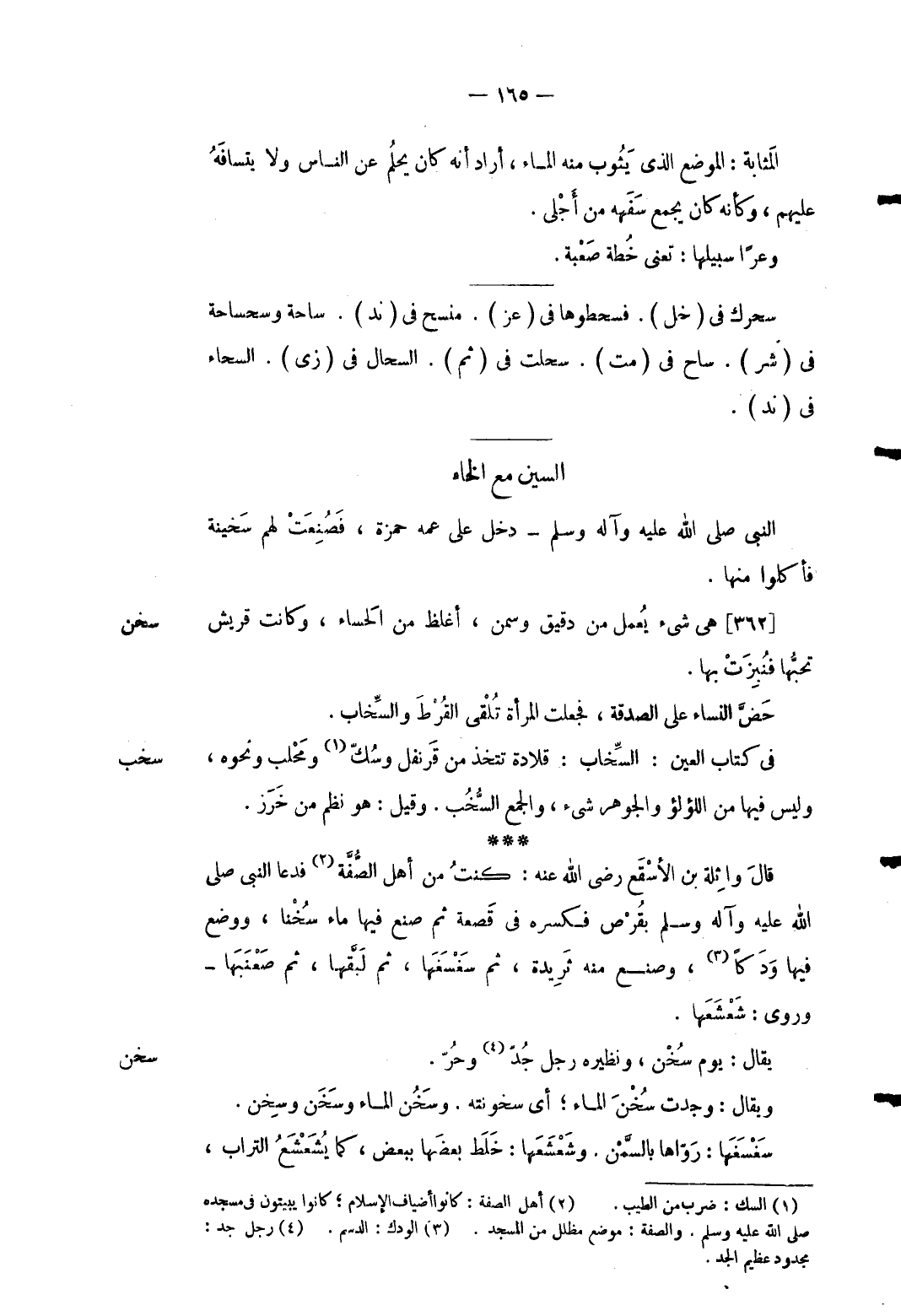 5 - المثابة: الْموضع الَّذِي يثوب مِنْهُ المَاء أَرَادَ أَنه كَانَ يحلم عَن النَّاس وَلَا يتسافه عَلَيْهِم وَكَأَنَّهُ كَانَ يجمع سفهه من أَجلي. وعراً سَبِيلهَا: تَعْنِي خطة صعبة. سحرك فِي (خل) . فسحطوها فِي (عز) . منسح فِي (ند) . ساحة وسحساحة فِي (شَرّ) . ساح فِي (مت) . سحلت فِي (ثمَّ) . السحال فِي (زِيّ) . السحاء فِي (ند) .