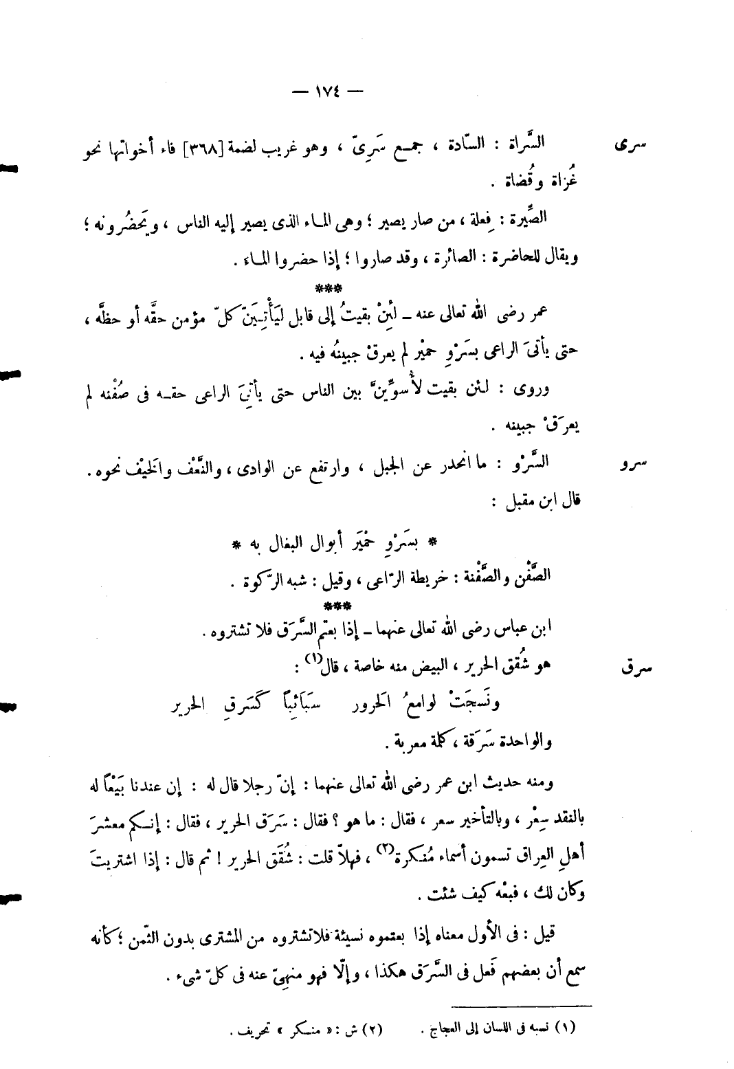 4 - سرى السراة: السَّادة جمع سرى وَهُوَ غَرِيب لضمة [368] فَاء أخواتها نَحْو غزَاة وقضاة. الصيرة: فعلة من صَار يصير إِلَيْهِ النَّاس ويحضرونه وَيُقَال للحاضرة: الصائرة وَقد صَارُوا إِذا حَضَرُوا المَاء. عمر رَضِي الله تَعَالَى عَنهُ لَئِن بقيت إِلَى قَابل ليَأْتِيَن كل مُؤمن حَقه أَو حَظه حَتَّى يأتى الراعى بسرو حمير عرق جَبينه فِيهِ. وروى: لَئِن بقيت لأسوين بَين النَّاس حَتَّى ياتي الرَّاعِي حَقه فِي صفنه لم يعرق جَبينه.