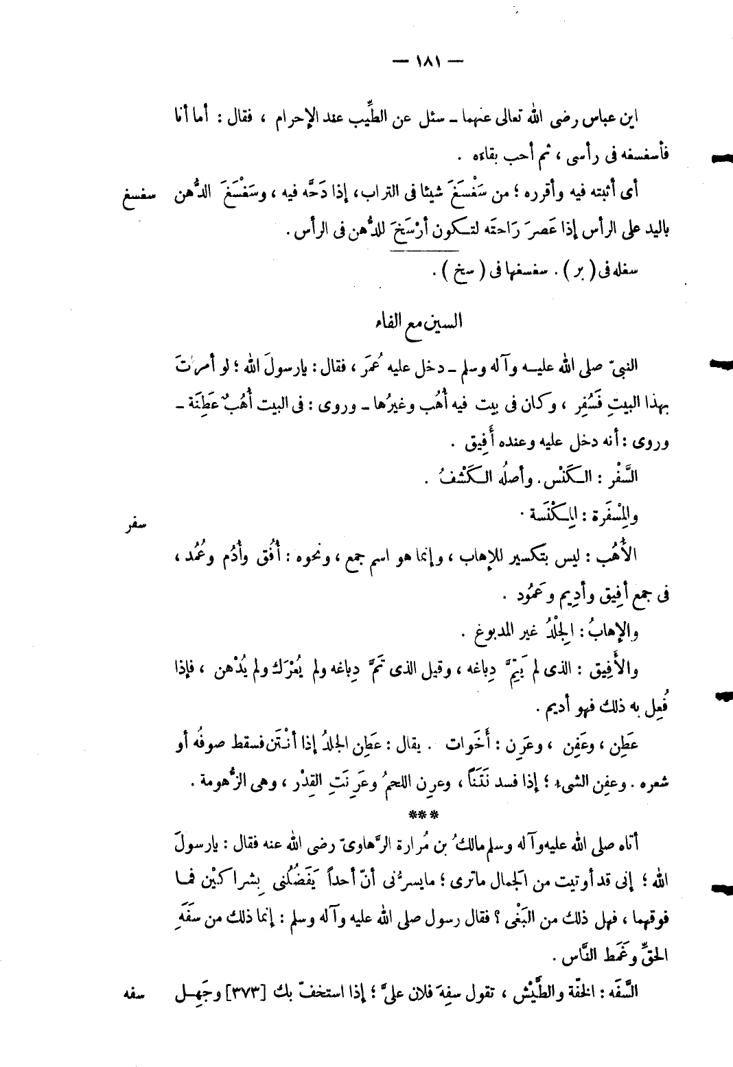 سفر الأُهب: لَيْسَ بتكسير للإهاب وَإِنَّمَا هُوَ اسْم جمع وَنَحْوه: أفق وأدم وعُمد فِي جمع أفِيق وأديم وعمود. والإهاب: الْجلد غير المدبوغ. والأفيق: الَّذِي لم يتم دباغه وَقيل الَّذِي تمَّ دباغه وَلم يعرك وَلم يدهن فَإِذا فُعل بِهِ ذَلِك فَهُوَ أَدِيم. عطن وعفن وعرن: أَخَوَات. يُقَال: عطن الْجلد إِذا أنتن فَسقط صوفه أَو شعره. وعفن الشَّيْء إِذا فسد نَتنًا وعرن اللَّحْم وعرنت الْقدر وَهِي الزهومة. أَتَاهُ صلى الله عَلَيْهِ وَسلم مَالك بن مرَارَة الرهاوي رَضِي الله عَنهُ فَقَالَ: يَا رَسُول الله إِنِّي قد أُوتيت من الْجمال مَا ترى مَا يسرني أَن أحدا يُفَضِّلُنِي بِشِرَاكَيْنِ فَمَا فَوْقهمَا فَهَل ذَلِك من البغى فَقَالَ رَسُول صلى الله عَلَيْهِ وَسلم: إِنَّمَا ذَلِك من سفه الْحق وغمط النَّاس.