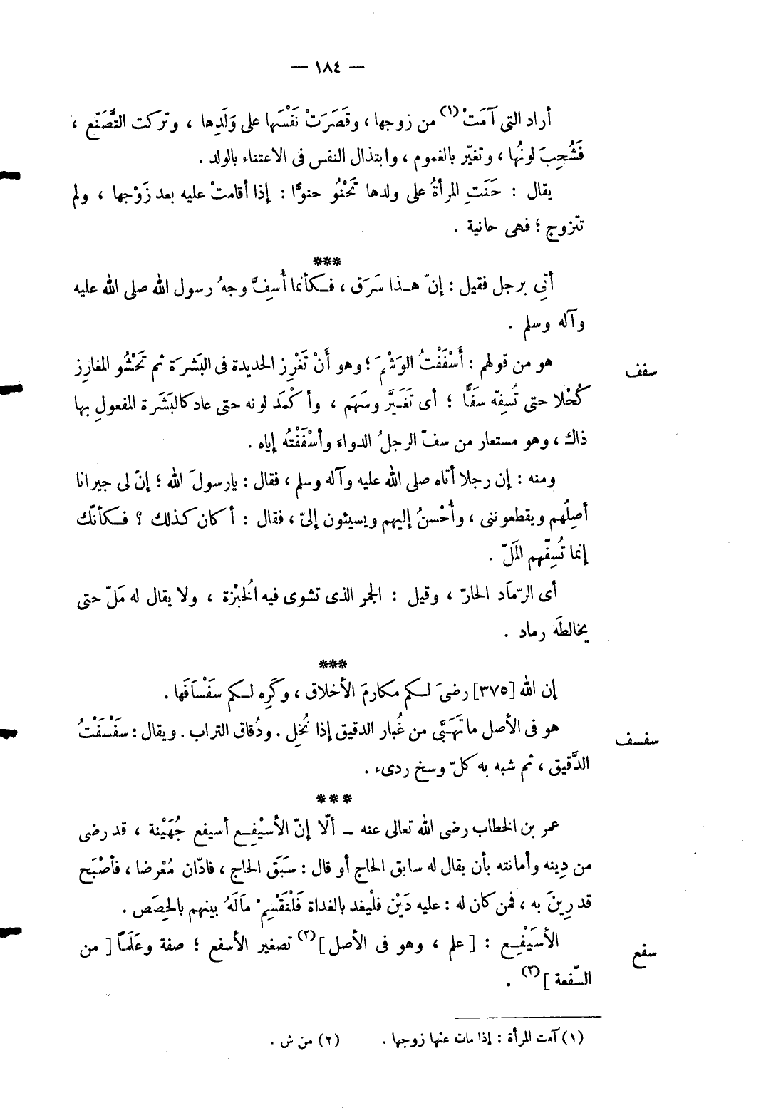 سفف هُوَ من قَوْلهم: أسففت الوشم وَهُوَ أَن تغرز الحديدة فِي الْبشرَة ثمَّ تحشو المغارز كحلا حَتَّى تسفه سفًّا أَي تغير وَسَهْم وأكمد لَونه حَتَّى عَاد كالبشرة الْمَفْعُول بهَا ذَاك وَهُوَ مستعار من سفّ الرجل الدَّوَاء وأسففته إِيَّاه. وَمِنْه: إِن رجلا أَتَاهُ صلى الله عَلَيْهِ وَسلم فَقَالَ: يَا رَسُول الله إِن لي جيرانا أصِلُهم ويقطعونني وأُحسن إِلَيْهِم ويسيئون إليّ فَقَالَ: أَكَانَ كَذَلِك فكأنك إِنَّمَا تسفهم المل. أَي الرماد الحارّ وَقيل: الْجَمْر الَّذِي تشوي فِيهِ الخبزة وَلَا يُقَال لَهُ ملّ حَتَّى يخالطه رماد. إِن الله [375] رضى لكم مَكَارِم الْأَخْلَاق وَكره لكم سفسافها