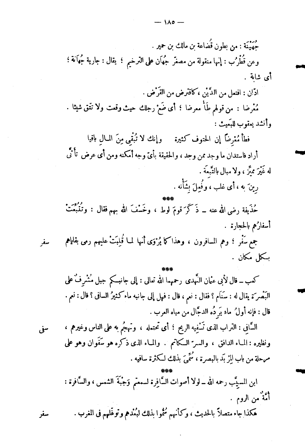 5 - جُهَيْنَة: من بطُون قضاعة بن مَالك بن حمير. وَعَن قطرب: إِنَّهَا منقولة من مصغر جهان على التَّرْخِيم يُقَال: جَارِيَة جهانة أَي شَابة. ادّان: افتعل من الدّين كاقترض من الْقَرْض. معرضًا: من قَوْلهم طأ معرضًا أَي ضع رجلك حَيْثُ وَقعت وَلَا تتق شَيْئا. وَأنْشد يَعْقُوب للبعيث: ... فطأ مُعْرِضاً إِن الحتوف كَثِيرَة ... وَإنَّك لَا تُبْقِي مِنَ المالِ بَاقِيا ... أَرَادَ فاستدان مَا وجد مِمَّن وجد والحقيقة بِأَيّ وَجه أمكنه وَمن أَي عرض تَأتي لَهُ غير مُمَيّز وَلَا مبال بالتَّبعة. رين بِهِ أَي غلب وفُعِلَ بِشَأْنِهِ. حُذَيْفَة رَضِي الله عَنهُ ذكر قوم لوط وَخسف الله بهم فَقَالَ: وتتبعت أسفارهم بِالْحِجَارَةِ.