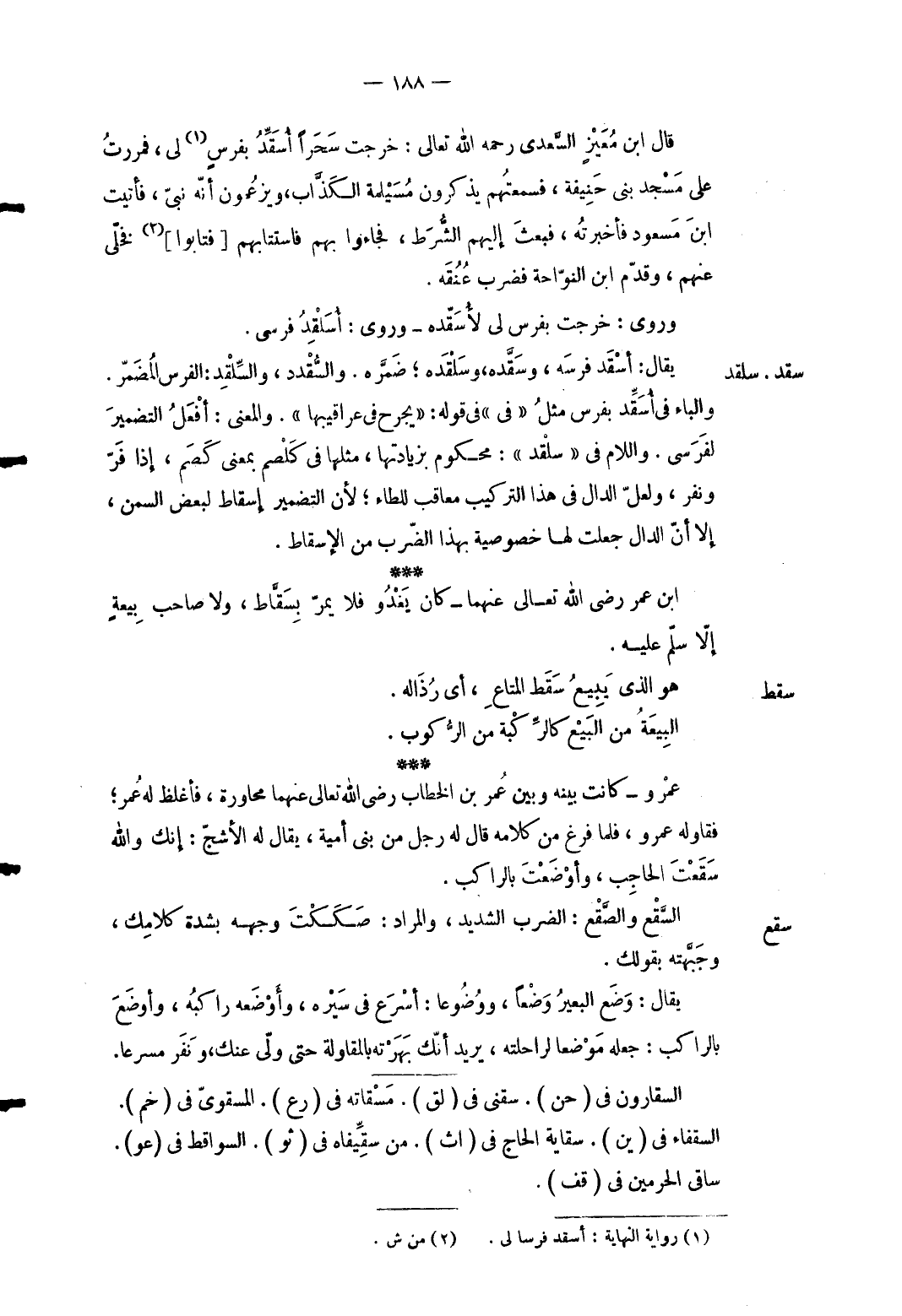 8 - قَالَ ابْن معيز السَّعْدِيّ رَحمَه الله تَعَالَى: خرجت سحرًا أسقد بفرس لى فمررت على مَسْجِد بني حنيفَة فَسَمِعتهمْ يذكرُونَ مُسَيْلمَة الْكذَّاب ويزعمون أَنه نبيّ فَأتيت ابْن مَسْعُود فَأَخْبَرته فَبعث إِلَيْهِم الشُّرط فَجَاءُوا بهم فاستتابهم [فتابوا] فخلّى عَنْهُم وقدّم ابْن النواحة فَضرب عُنُقه. وروى: خرجت بفرس لي لأُسقده وروى: أسلقد فرسى.