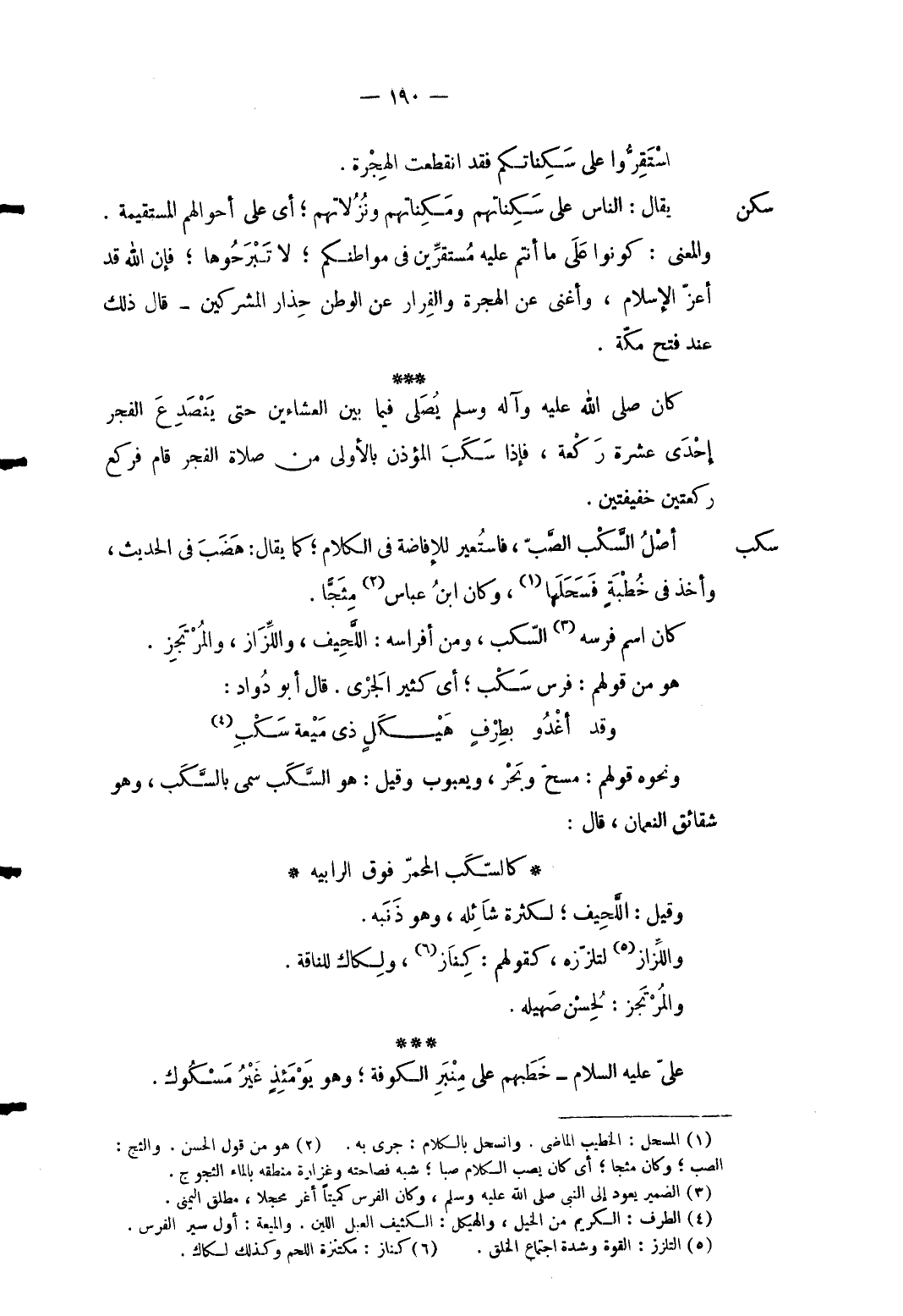 سكن يُقَال: النَّاس على سكناتهم ومكناتهم ونزلاتهم أَي على أَحْوَالهم المستقيمة وَالْمعْنَى: كونُوا على مَا أَنْتُم عَلَيْهِ مستقرين فِي مواطنكم لَا تبرحوها فَإِن الله قد أعزَّ الْإِسْلَام وأغنى عَن الْهِجْرَة والفرار عَن الوطن حذار الْمُشْركين قَالَ ذَلِك عِنْد فتح مَكَّة. كَانَ صلى الله عَلَيْهِ وَسلم يُصَلِّي فِيمَا بَين العشاءين حَتَّى ينصدع الْفجْر إِحْدَى عشرَة رَكْعَة فَإِذا سكب الْمُؤَذّن بِالْأولَى من صَلَاة الْفجْر قَامَ فَرَكَعَ رَكْعَتَيْنِ خفيفتين.