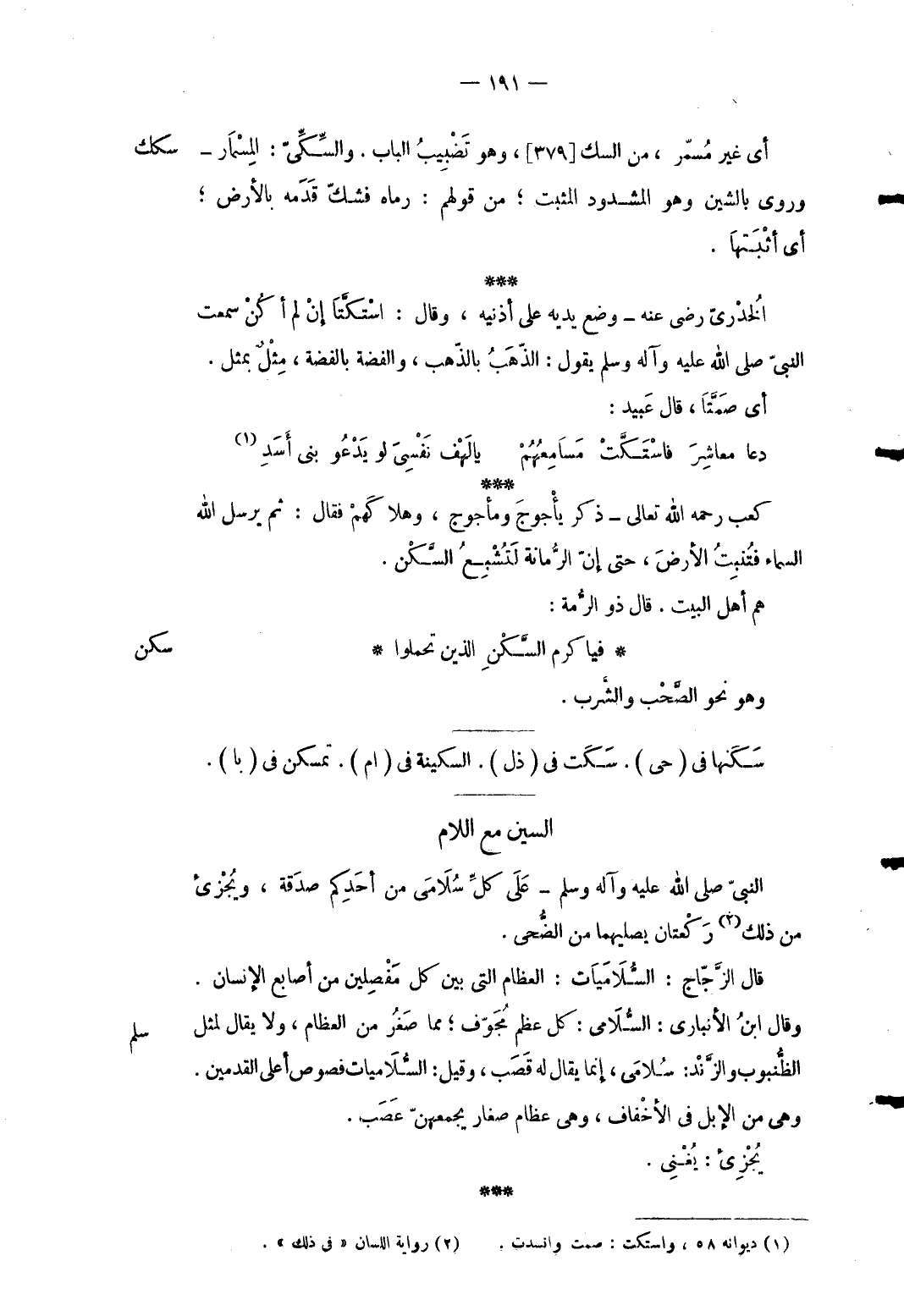 1 - سِكَك أَي غير مسمر من السك [379] وَهُوَ تضبيب الْبَاب. والسكى: المسمار سِكَك وروى بالشين وَهُوَ المشدود الْمُثبت من قَوْلهم: رَمَاه فشكّ قدمه بِالْأَرْضِ أَي أثبتها. الْخُدْرِيّ رَضِي الله عَنهُ وضع يَدَيْهِ على أُذُنَيْهِ وَقَالَ: استكَّتَا إِن لم أكن سَمِعت النَّبِي صلى الله عَلَيْهِ وَسلم يَقُول: الذَّهَب بِالذَّهَب وَالْفِضَّة بِالْفِضَّةِ مثل بِمثل. أَي صمَّتا قَالَ عبيد: ... دَعَا معاشِرَ فاستكت مسامعهم ... يالهف نَفْسِيَ لَو يَدْعُو بني أَسَدِ ... كَعْب رَحمَه الله تَعَالَى ذكر يَأْجُوج وَمَأْجُوج وهلا كهم فَقَالَ: ثمَّ يُرْسل الله السَّمَاء فتنبت الأَرْض حَتَّى إِن الرمانة لتشبع السكن.
