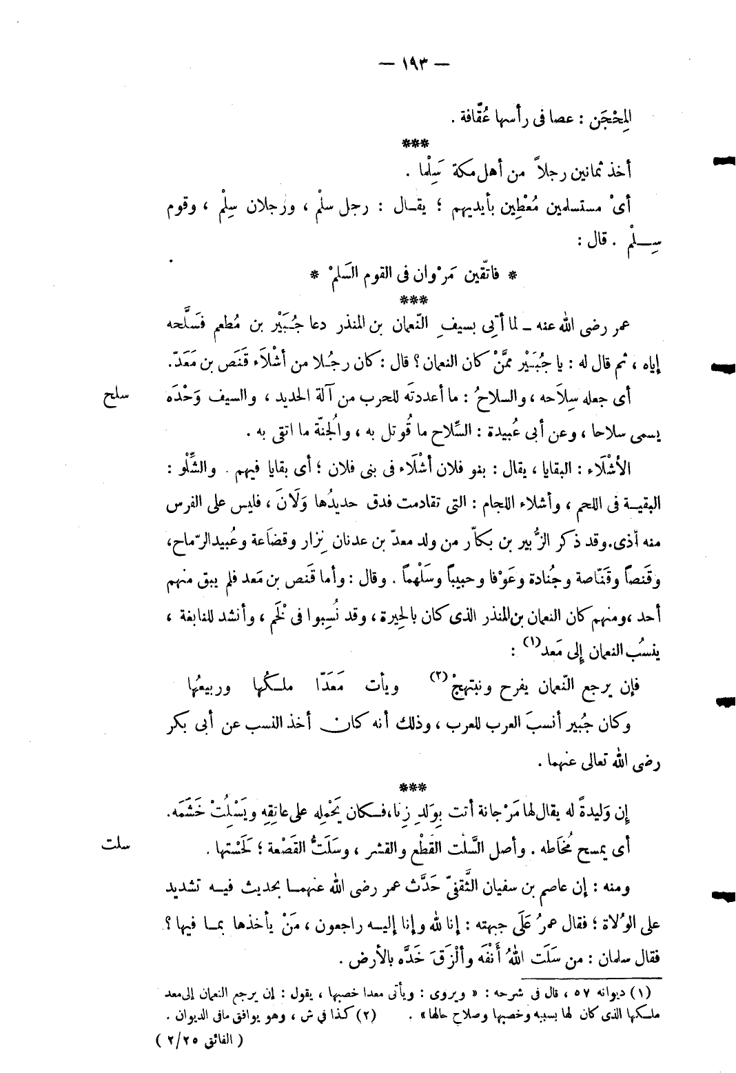 3 - المحجن: عَصا فِي رَأسهَا عقافة. أَخذ ثَمَانِينَ رجلا من أهل مَكَّة سلما. أَي مستسلمين معطين بِأَيْدِيهِم يُقَال: رجل سلم ورجلان سلم وَقوم سلم. قَالَ: ... فاتّقين مَرْوان فِي الْقَوْم السَلمْ ... عمر رَضِي الله عَنهُ لما أُتِي بِسيف النُّعْمَان بن الْمُنْذر دَعَا جُبَير بن مطعم فسَّلحه إِيَّاه ثمَّ قَالَ لَهُ: يَا جُبَير مِمَّن كَانَ النُّعْمَان قَالَ: كَانَ رجلا من أشلاء قنص بن معد.