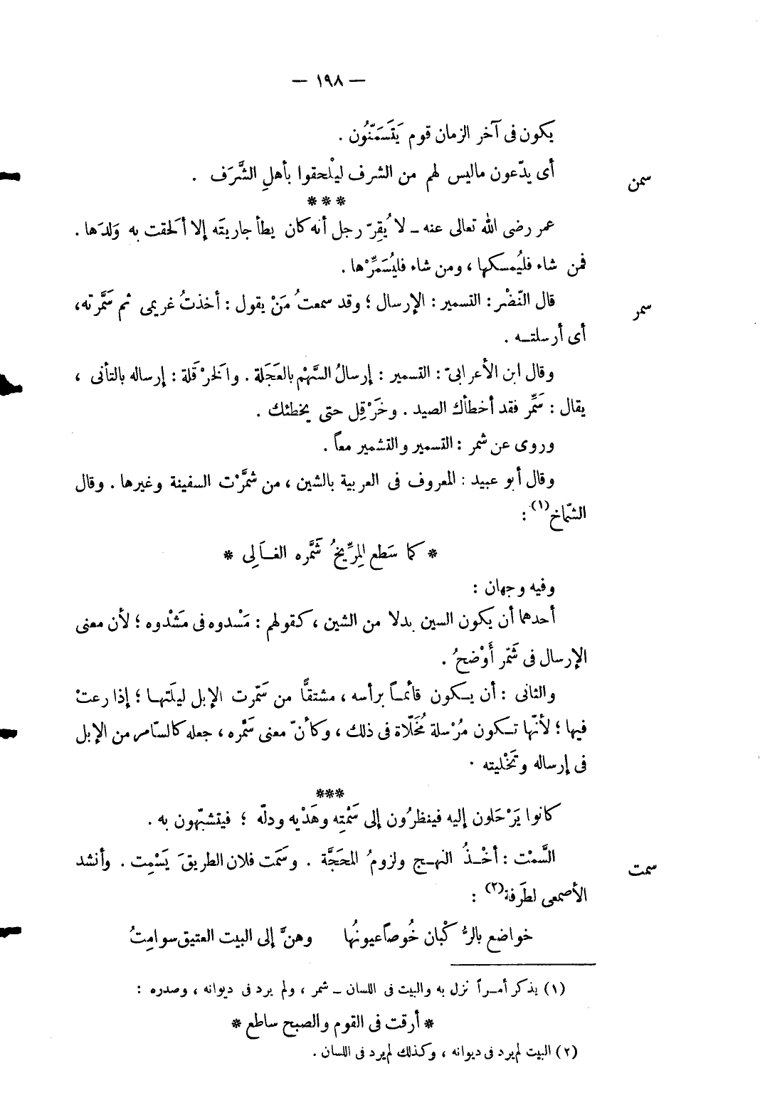 سمن أَي يدّعون مَا لَيْسَ لَهُم من الشّرف ليلحقوا بِأَهْل الشَّرف. عمر رَضِي الله تَعَالَى عَنهُ لَا يُقرّ رجل أَنه كَانَ يطَأ جَارِيَته إِلَّا ألحقت بِهِ وَلَدهَا. فَمن شَاءَ فليمسكها وَمن شَاءَ فليسمرها. قَالَ النَّضر: التسمير: الْإِرْسَال وَقد سَمِعت من يَقُول: أخذت غريمي ثمَّ سمرته