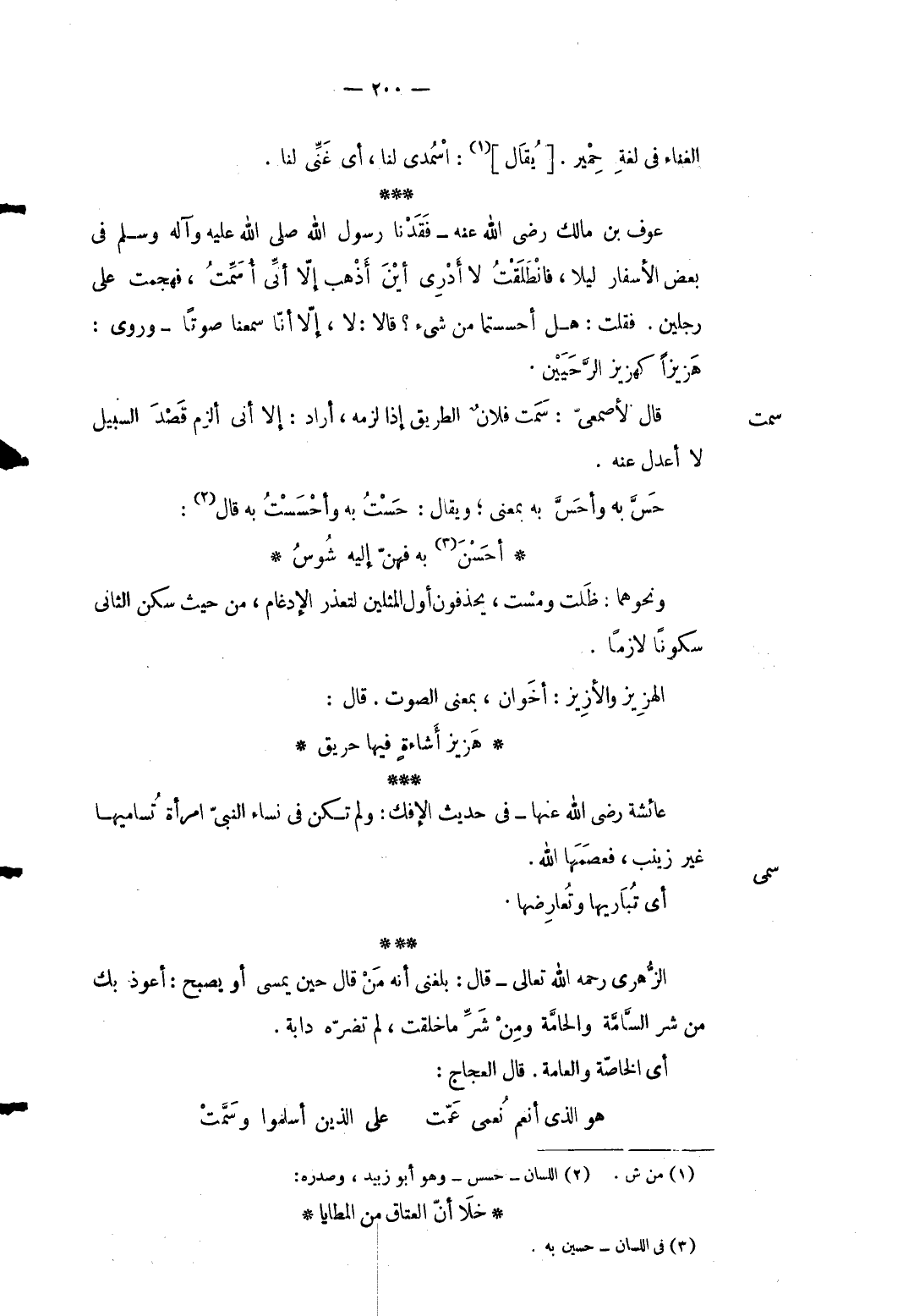 سمت قَالَ الْأَصْمَعِي: سمت فلَان الطَّرِيق إِذا لزمَه أَرَادَ: إِلَّا أَنِّي ألزم قصد السَّبِيل لَا أعدل عَنهُ. حسَّ بِهِ وأحسَّ بِهِ بِمَعْنى وَيُقَال: حست بِهِ وأحسست بِهِ قَالَ: ... أحَسْنَ بِهِ فهنّ إِلَيْهِ شُوسُ ... وَنَحْوهمَا: ظلت ومست يحذفون أول المثلين لتعذر الْإِدْغَام من حَيْثُ سكن الثَّانِي سكوناً لَازِما. الهزيز والأزيز: أَخَوان بِمَعْنى الصَّوْت. قَالَ: ... هَزيز أَشاءةٍ فِيهَا حريق ... عَائِشَة رَضِي الله عَنْهَا فِي حَدِيث الْإِفْك: وَلم تكن فِي نسَاء النَّبِي امراة تساميها غير زَيْنَب فعصمها الله.