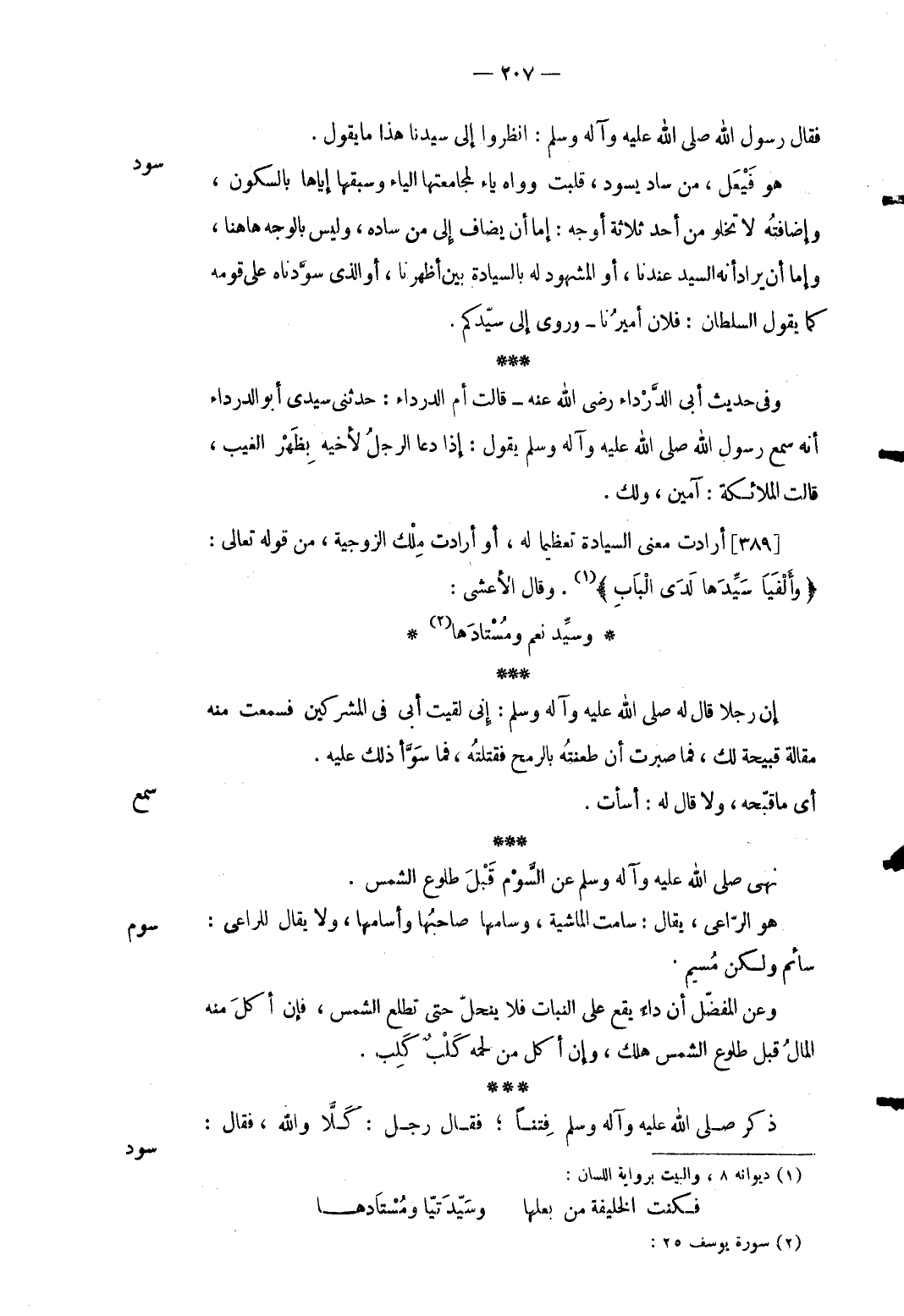 سود هُوَ فيعل من سَاد يسود قلبت وواه يَاء لمجامعتها الْيَاء وسبقها إِيَّاهَا بِالسُّكُونِ وإضافته لَا تَخْلُو من أحد ثَلَاثَة أوجه: إِمَّا أَن يُضَاف إِلَى من ساده وَلَيْسَ بِالْوَجْهِ هَاهُنَا وَإِمَّا أَن يُرَاد أَنه السَّيِّد عندنَا أَو الْمَشْهُود لَهُ بالسيادة بَين أظهرنَا أَو الَّذِي سوَّدناه على قومه كَمَا يَقُول السُّلْطَان: فلَان أميرنا وروى إِلَى سيدكم. وَفِي حَدِيث أبي الدَّرْدَاء رَضِي الله عَنهُ قَالَت أم الدَّرْدَاء: حَدثنِي سَيِّدي أَبُو الدَّرْدَاء أَنه سمع رَسُول الله صلى الله عَلَيْهِ وَسلم يَقُول: إِذا دَعَا الرجل لِأَخِيهِ بِظهْر الْغَيْب قَالَت الْمَلَائِكَة: آمين وَلَك. [389] أَرَادَت معنى السِّيَادَة تَعْظِيمًا لَهُ أَو أَرَادَت ملك الزَّوْجِيَّة من قَوْله تَعَالَى: {وأَلْفَيَا سَيِّدَها لَدَى الْبَابٍ} . وَقَالَ الْأَعْشَى: ... وسيِّد نعم ومُسْتادَها ... إِن رجلا قَالَ لَهُ صلى الله عَلَيْهِ وَسلم: إِنِّي لقِيت أبي فِي الْمُشْركين فَسمِعت مِنْهُ مقَالَة قبيحة لَك فَمَا صبرت أَن طعنته بِالرُّمْحِ فَقتلته فَمَا سوَّأ ذَلِك عَلَيْهِ.