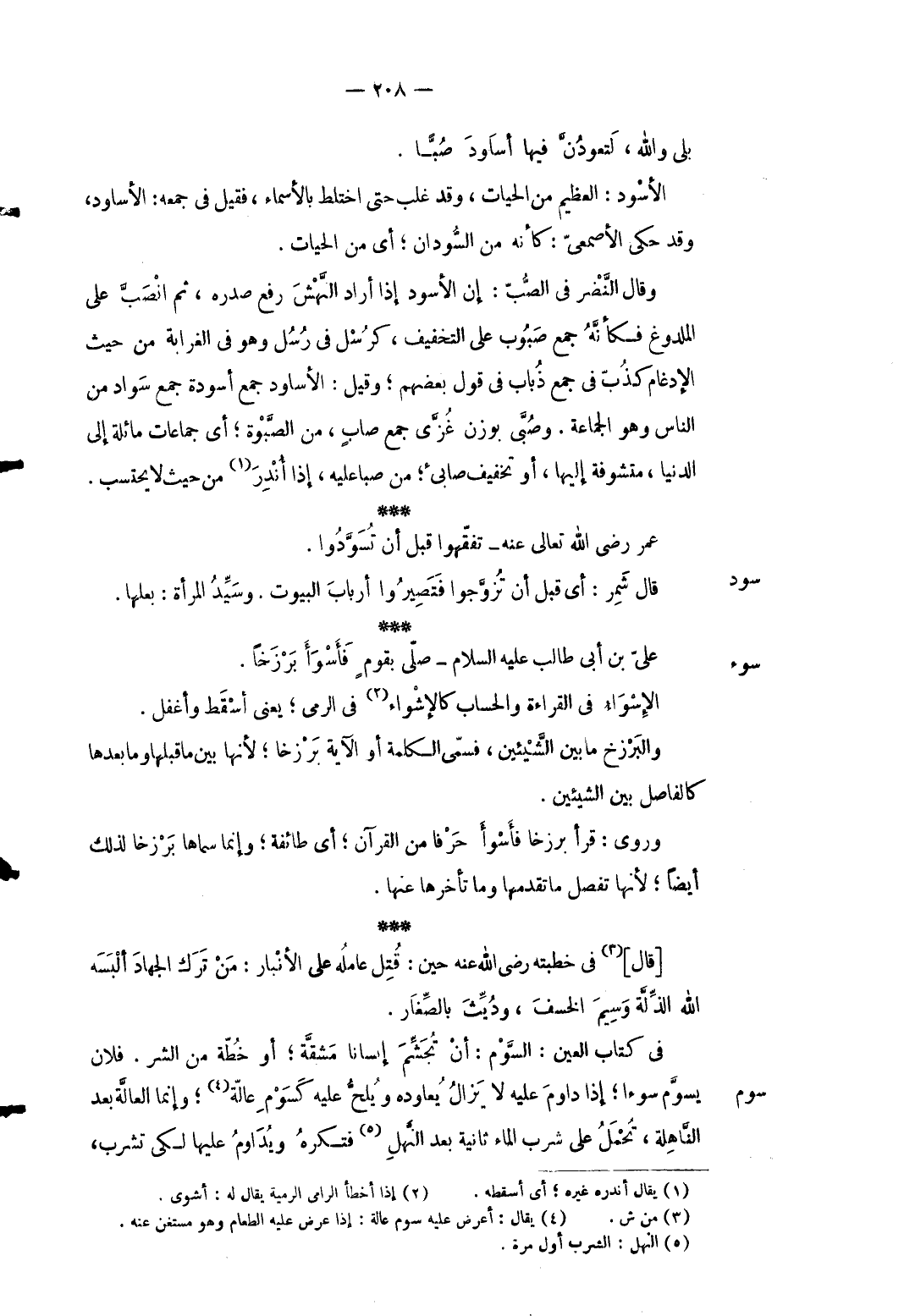 8 - بلَى وَالله لتعودن فِيهَا أساود صُبَّا. الْأسود: الْعَظِيم من الْحَيَّات وَقد غلب حَتَّى اخْتَلَط بالأسماء فَقيل فِي جمعه الأساود وَقد حكى الْأَصْمَعِي كَأَنَّهُ من السودَان أَي من الْحَيَّات. وَقَالَ النَّضر فِي الصُّبّ: إِن الْأسود إِذا أَرَادَ الهش رفع صَدره ثمَّ انصبَّ على الملدوغ فَكَأَنَّهُ جمع صبوب على التَّخْفِيف كرُسْل فِي رُسُل وَهُوَ فِي الغرابة من حَيْثُ الْإِدْغَام كذبّ فِي جمع ذُبَاب فِي قَول بَعضهم وَقيل: الأساود جمع أَسْوِدَة جمع سَواد من النَّاس وَهُوَ الْجَمَاعَة. وصبَّي بِوَزْن غزَّي جمع صاب من الصبَّوة أَي جماعات مائلة إِلَى الدُّنْيَا متشوفة إِلَيْهَا أَو تَخْفيف صابىء من صبا عَلَيْهِ إِذا أنذر من حَيْثُ لَا يحْتَسب. عمر رَضِي الله تَعَالَى عَنهُ تفقهوا قبل أَن تسودوا.