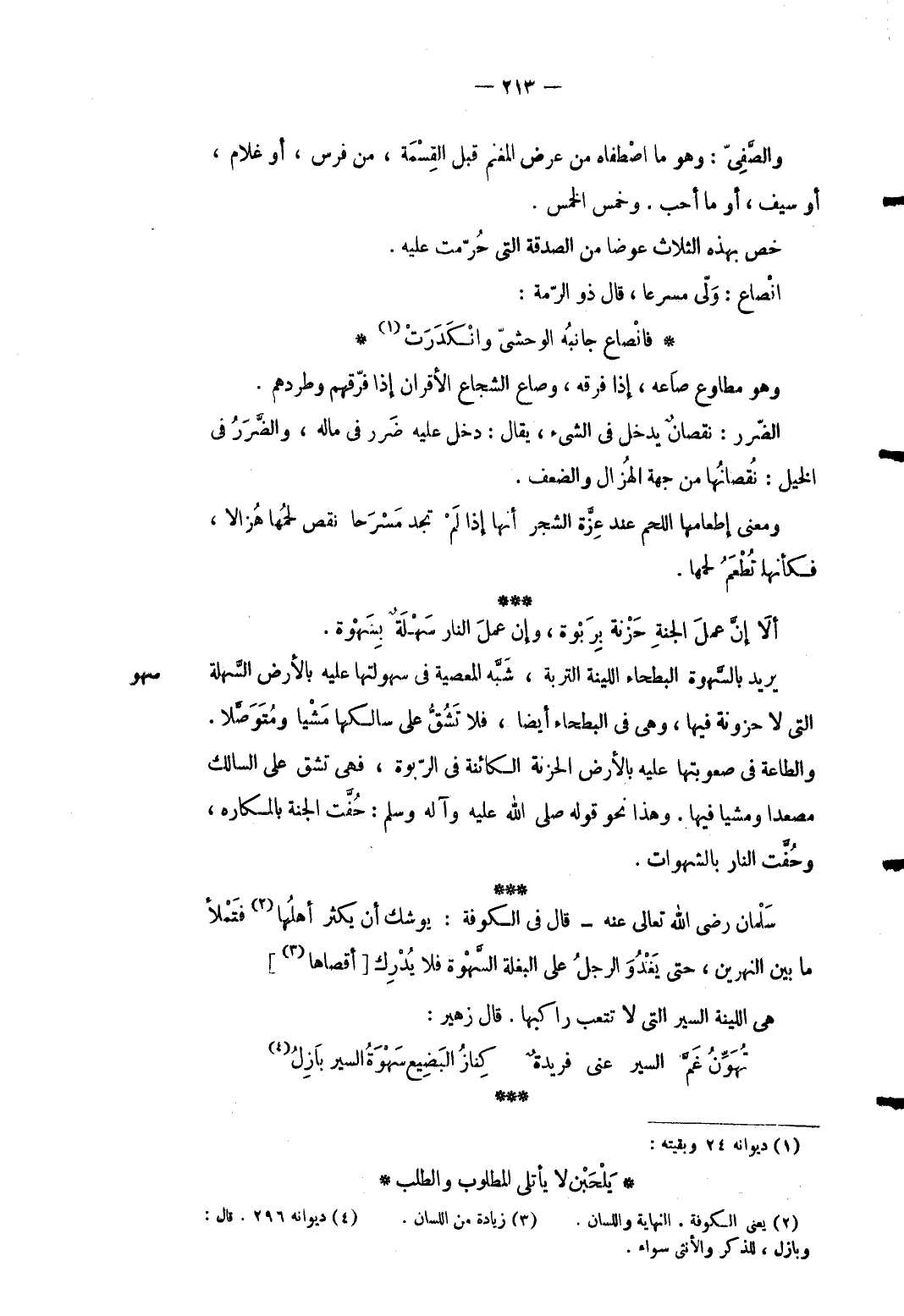 3 - والصفي: هُوَ مَا اصطفاه من عرض الْمغنم قبل الْقِسْمَة من فرس أَو غُلَام أَو سيف أَو مَا أحب. وَخمْس الْخمس. خص بِهَذِهِ الثَّلَاث عوضا من الصَّدَقَة الَّتِي حرمت عَلَيْهِ. انصاع: ولى مسرعا قَالَ ذُو الرمة: ... فانْصاع جانبُه الوحشيّ وانْكَدَرَتْ ... وَهُوَ مُطَاوع صاعه إِذا فرقه وَصَاع الشجاع الأقران إِذا فرقهم وطردهم. الضَّرَر: نُقْصَان يدْخل فِي الشَّيْء يُقَال: دخل عَلَيْهِ ضَرَر فِي مَاله وَالضَّرَر فِي الْخَيل: نقصانهتا من جِهَة الهزال والضعف. وَمعنى إطعامها اللَّحْم عِنْد عزة الشّجر أَنَّهَا إِذا لم تَجِد مسرحا نقص لَحمهَا هزالًا فَكَأَنَّهَا تطعم لَحمهَا. أَلا أَن عمل الْجنَّة حزنة بِرَبْوَةٍ وَإِن عمل النَّار سهلة بِسَهْوَةٍ.