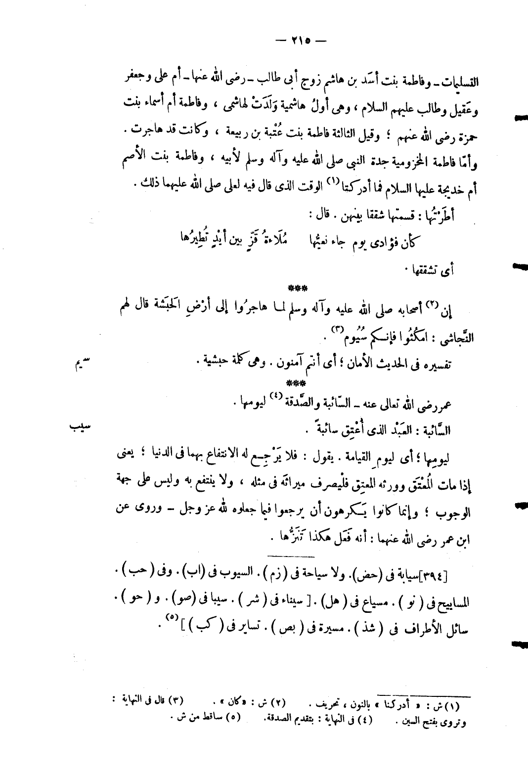 5 - التسليمات وَفَاطِمَة بنت أَسد بن هَاشم زوج أبي طَالب رَضِي الله عَنْهَا أم عَليّ وجعفر وَعقيل وطالب عَلَيْهِم السَّلَام وَهِي أول هاشمية ولدت لهاشمي وَفَاطِمَة أم أَسمَاء بنت حَمْزَة رَضِي الله عَنْهُم وَقيل الثَّالِثَة فَاطِمَة بنت عتبَة بن ربيعَة وَكَانَت قد هَاجَرت. وَأما فَاطِمَة المخزومية جدة النَّبِي صلى الله عَلَيْهِ وَسلم لِأَبِيهِ وَفَاطِمَة بنت الْأَصَم أم خَدِيجَة عَلَيْهَا السَّلَام فَمَا أدركتا الْوَقْت الَّذِي قَالَ فِيهِ لعَلي صلى الله عَلَيْهِمَا ذَلِك. أطرتها: قسمتهَا شققا بَينهُنَّ. قَالَ: ... كَأَن فُؤَادِي يَوْم جَاءَ نعيُّها ... مُلاَءةُ قًزٍّ بَين أيْدٍ تُطِيرُها ... أَي تشققها. إِن أَصْحَابه صلى الله عَلَيْهِ وَسلم لما هَاجرُوا إِلَى أَرض الْحَبَشَة قَالَ لَهُم النجاشى: امكثوا فَإِنَّكُم سيوم.