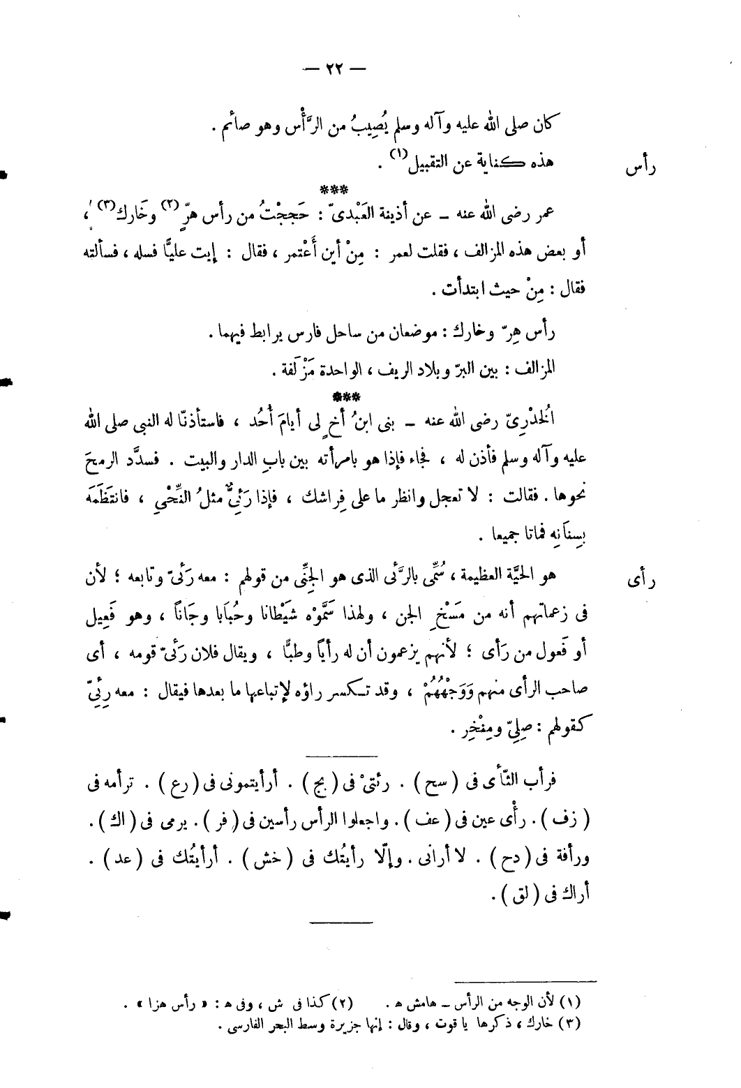 رَأس هَذِه كِنَايَة عَن التَّقْبِيل. عمر رَضِي الله عَنهُ عَن أذينة الْعَبْدي: حججْت من رَأس هرٍ وخارك أَو بعض هَذِه المزالف فَقلت لعمر: من أَيْن أعتمر فَقَالَ: إِيت عليا فسله فَسَأَلته فَقَالَ: من حَيْثُ ابتدأت. رَأس هر وخارك: موضعان من سَاحل فَارس يرابط فيهمَا. المزالف: بَين الْبر وبلاد الرِّيف الْوَاحِدَة مزلفة. الْخُدْرِيّ رَضِي الله عَنهُ بنى ابْن أَخ لي أَيَّام أُحد فَاسْتَأْذَنا لَهُ النَّبِي صلى الله عَلَيْهِ وَسلم فَأذن لَهُ فجَاء فَإِذا هُوَ بامرأته بَين بَاب الدَّار وَالْبَيْت. فسدد الرمْح نَحْوهَا. فَقَالَت: لَا تعجل وَانْظُر مَا على فراشك فَإِذا رئى مثل النحى فانتظمه بسنانه فماتا جَمِيعًا.