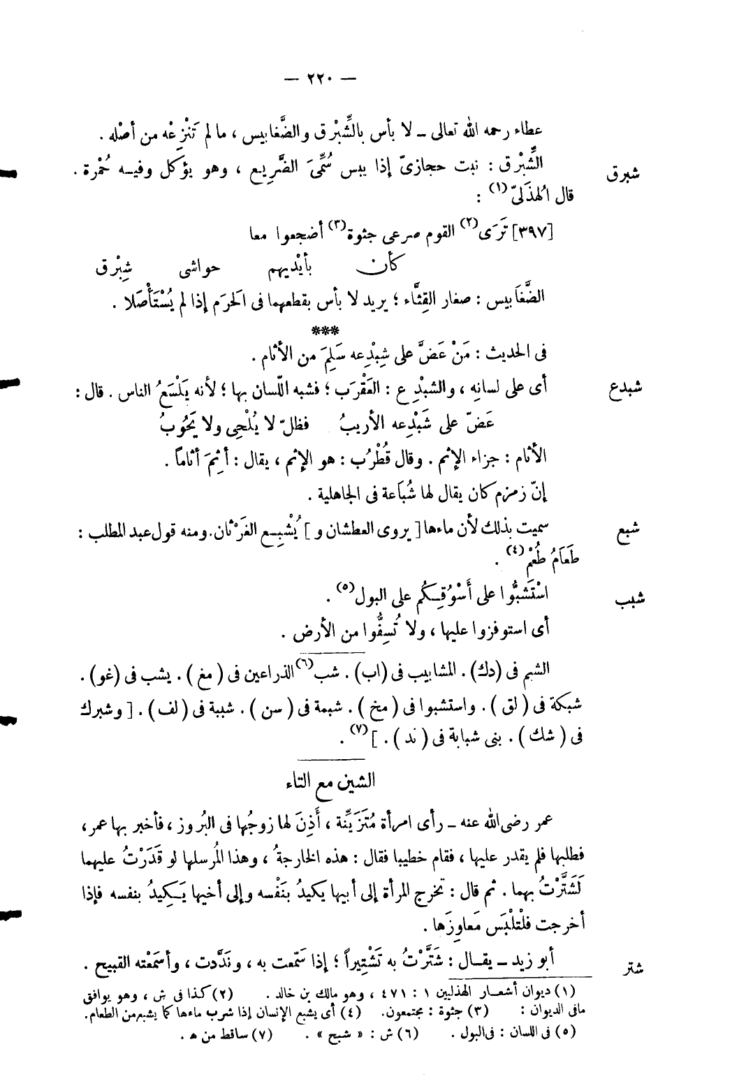 شَبَّبَ استشبوا على أسوقكم على الْبَوْل. أَي استوفزوا عَلَيْهَا وَلَا تسفُّوا من الأَرْض. الشم فِي (دك) . المشابيب فِي (اب) . شب الذراعين فِي (مغ) . يشب فِي (غو) . شبكة فِي (لق) . واستشبوا فِي (مخ) . شبمة فِي (سنّ) . شببة فِي (لف) . [وشبرك فِي (شكّ) . بني شَبابَة فِي (ند) .] (7) .