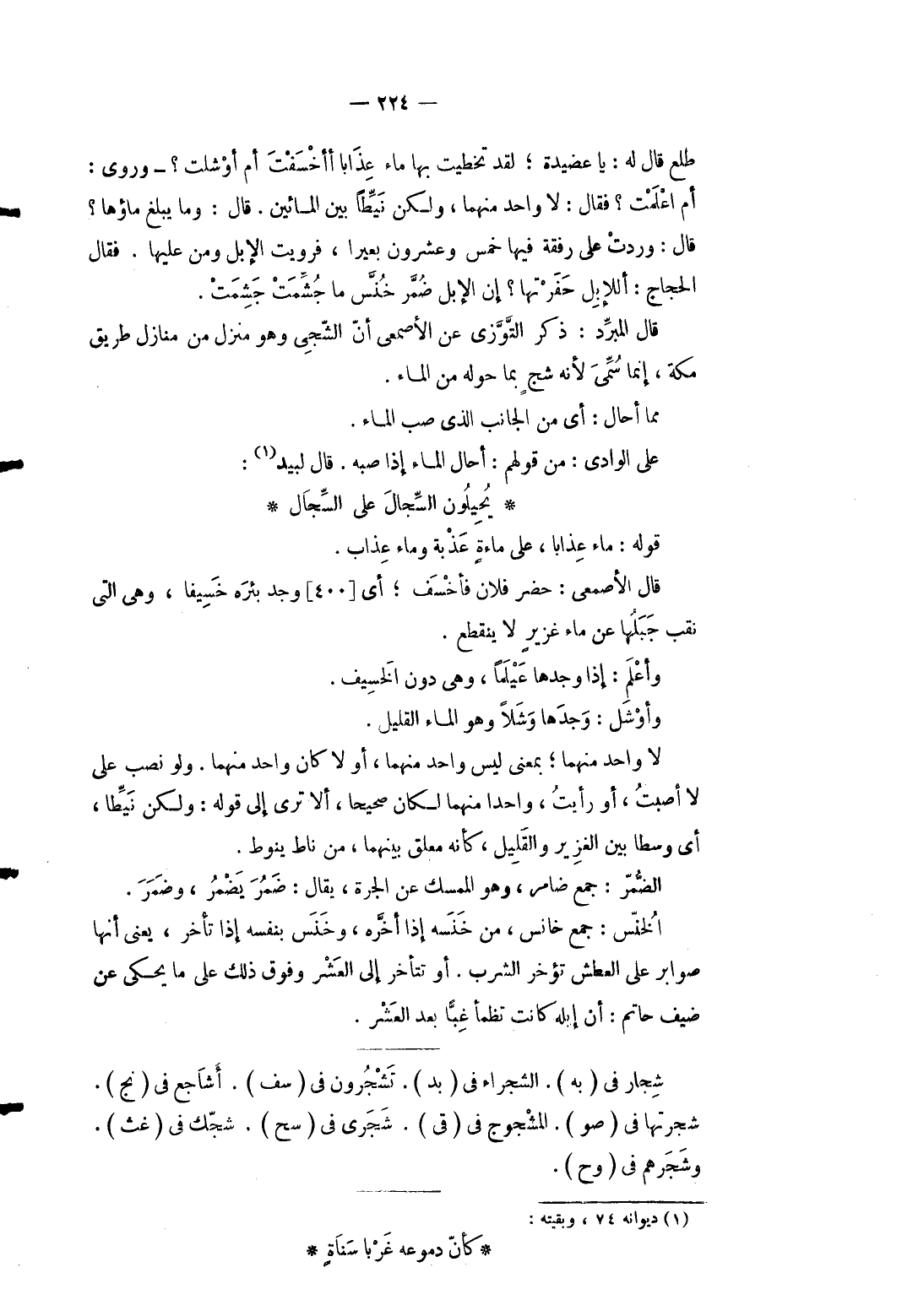 4 - طلع قَالَ لَهُ: يَا عضيدة لقد تخطيت بهَا مَاء عذَابا أأخسفت أم أوشلت وروى: أم اعلمت فَقَالَ: لَا وَاحِد مهنما وَلَكِن نيطاً بَين المائين. قَالَ: وَمَا يبلغ مَاؤُهَا قَالَ: وَردت على رفْقَة فِيهَا خمس وَعِشْرُونَ بَعِيرًا فرويت الْإِبِل وَمن عَلَيْهَا. فَقَالَ: الْحجَّاج: أللإبل حفرتها إِن الْإِبِل ضمر خنس مَا جسمت جشمت. قَالَ الْمبرد: ذكر التوزي عَن الْأَصْمَعِي أَن الشجي وَهُوَ منزل من منَازِل طَرِيق مَكَّة إِنَّمَا سمي لِأَنَّهُ شج بِمَا حوله من المَاء. مِمَّا أحَال: أَي من الْجَانِب الَّذِي صب المَاء. على الْوَادي: من قَوْلهم: أحَال المَاء إِذا صبه. قَالَ لبيد: ... يُحِيُلون السِّجالَ على السِّجَال ... قَوْله: مَاء عذَابا على مَاءَهُ عذبة وَمَاء عَذَاب. قَالَ الْأَصْمَعِي: حضر فلَان فأخسف أَي [4] وجد بئره خسيفا وَهِي الَّتِي نقب جبلها عَن مَاء غزير لَا يَنْقَطِع. وَأعلم: إِذا وجدهَا عيلماً وَهِي دون الخسيف. وأوشل: وجدهَا وشلاً وَهُوَ المَاء الْقَلِيل. لَا وَاحِد مِنْهُمَا بِمَعْنى لَيْسَ وَاحِد مِنْهُمَا أَو لَا كَانَ وَاحِد مِنْهُمَا. وَلَو نصب على لَا أصبت أَو رَأَيْت وَاحِدًا مِنْهُمَا لَكَانَ صَحِيحا أَلا ترى إِلَى قَوْله: وَلَكِن نيطا أَي وسطا بَين الغزير والقليل كَأَنَّهُ مُعَلّق بَينهمَا من ناط ينوط. الضمر: جمع ضامر وَهُوَ الممسك عَن الجرة يُقَال: ضمر يضمر وضمر. الخنس: جمع خانس من خنسه إِذا أَخّرهُ وخنس بِنَفسِهِ إِذا تَأَخّر يَعْنِي أَنَّهَا صوابر على الْعَطش تُؤخر الشّرْب. أَو تتأخر إِلَى الْعشْر وَفَوق ذَلِك على مَا يحْكى عَن ضيف حَاتِم: أَن إبِله كَانَت تظمأ غبا بعد الْعشْر. شجار فِي (بِهِ) . الشجراء فِي (بُد) . تشجرون فِي (سف) . أشاجع فِي (نج) . شجرتها فِي (صو) . المشجوج فِي (قي) . شجري فِي (سح) . شجك فِي (غث) . وشجرهم فى (وح) .