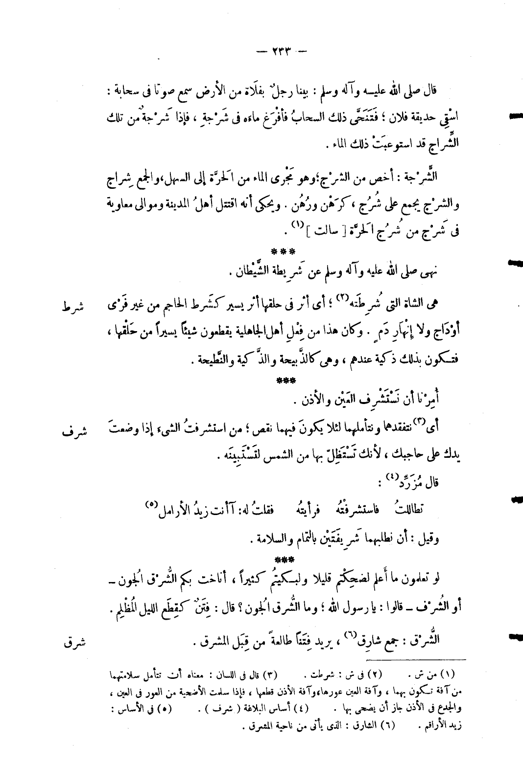3 - قَالَ صلى الله عَلَيْهِ وَسلم: بَينا رجل بفلاة من الأَرْض سمع صَوتا فِي سَحَابَة: اسقي حديقة فلَان فَتنحّى ذَلِك السَّحَاب فأفرغ مَاءَهُ فِي شرجة فَإِذا شرجة من تِلْكَ الشراج قد استوعبت ذَلِك المَاء. الشرجة: أخص من الشرج وَهُوَ مجْرى المَاء من الحرَّة إِلَى السهل وَالْجمع شراج والشرج يجمع على شُرُج كرهن ورُهُن. ويحكى أَنه اقتتل أهل الْمَدِينَة وموالى مُعَاوِيَة فِي شرج من شُرُج الْحرَّة [سَالَتْ] . نهى صلى الله عَلَيْهِ وَسلم عَن شريطة الشَّيْطَان.