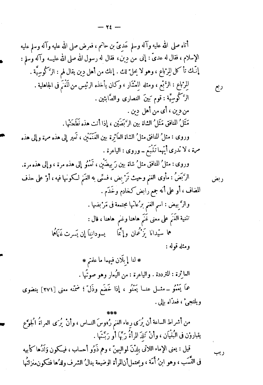 ربض الربض: مأوى الْغنم وَحَيْثُ تربض فَسُمي بِهِ الْغنم لكَونهَا فِيهِ أَو على حذف الْمُضَاف أَو على أَنه جمع رابض كخادم وخدم. والربيض: اسْم الْغنم برعاتها مجتمعة فِي مربضها. تَثْنِيَة الْغنم على معنى غنم هَا هُنَا وغنم هَا هُنَا قَالَ: ... هما سيدانا يَزْعُمان وإنَّمَا ... يسودانِنَا إِن يَسرت غَنَماهُما ... وَمثله قَوْله: ... لنا إبِلاَن فيهمَا مَا علمْتُم ... العائرة: المترددة: والياعرة: من اليعار وَهُوَ صَوتهَا. عَمَّا يعمو مثل عَنَّا يعنو إِذا خضع وذل ضمنه معنى [271] ينضوى ويلتجىء فعدّاه بإلى. من أَشْرَاط السَّاعَة أَن يرى رعاء الْغنم رُءُوس النَّاس وَأَن يُرى العراة الجوَّع يتبارون فِي الْبُنيان وَأَن تَلد الْمَرْأَة رَبهَا أَو ربتها.