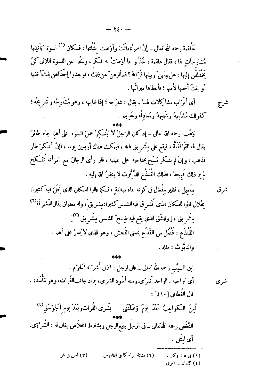 شَرق مفعيل نَظِير مفعال فِي كَونه بِنَاء مُبَالغَة مفكما قَالُوا للمكان الذى يحل فِيهِ كثيرا: مخلال قَالُوا للمكان الذى تشرق فِيهِ الشَّمْس كثيرا: مشريق وَله مَعْنيانِ يُقَال للمشرقة مشريق [وللشق الَّذِي يَقع فِيهِ ضح الشَّمْس مشريق] القنذع: فنعل من القذع بِمَعْنى الْفُحْش وَهُوَ الَّذِي لَا يغار على أَهله. والديوث: مثله. ابْن الْمسيب رَحمَه الله تَعَالَى قَالَ رجل: انْزِلْ أشراء الْحرم.