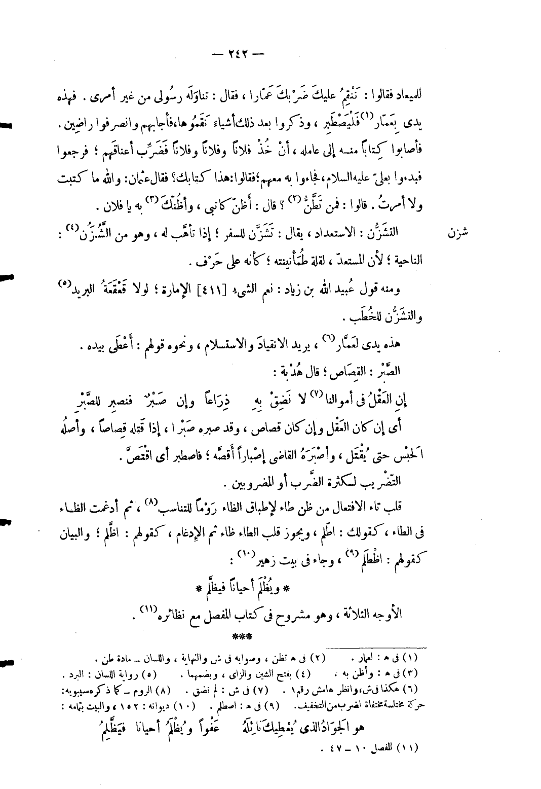 شزن التشزن: الاستعداد يُقَال: تشزن للسَّفر إِذا تأهب لَهُ وَهُوَ من التشزن: النَّاحِيَة لِأَن المستعد لقلَّة طمأنينة كَأَنَّهُ على حرف. وَمِنْه قَول عبيد الله بن زِيَاد: نعم الشىء [411] الْإِمَارَة لَوْلَا قعقعة الْبَرِيد والتشزن للخطب. هَذِه يَدي لعمَّار يُرِيد الانقياد والاستسلام وَنَحْوه قَوْلهم: أعْطى بِيَدِهِ. الصَّبْر: الْقصاص قَالَ هدبة: ... إِن العَقْلُ فى أَمْوَالنَا (7) لَا نضق بِهِ ... ذِرَاعا وَإِن صَبْرٌ فنصبِر للصَّبْرِ ... أَي إِن كَانَ الْعقل وَإِن كَانَ قصاص وَقد صبره صبرا إِذا قَتله قصاصا وَأَصله الْحَبْس حَتَّى يُقتل وأصبره القَاضِي إصباراً أقصه فاصطبر أَي اقتصَّ. التضريب لِكَثْرَة الضَّرْب أَو المضروبين. قلب تَاء الافتعال من ظن طاء لإطباق الظَّاء روماً للتناسب ثمَّ أدغمت الظَّاء فِي الطَّاء كَقَوْلِك: اطلم وَيجوز قلب الطَّاء ظاء ثمَّ الْإِدْغَام كَقَوْلِهِم: اظَّلم وَالْبَيَان كَقَوْلِهِم: اظطلم وَجَاء فِي بَيت زُهَيْر: ... ويُظْلَم أَحْيَانًا فيظَّلم ... الْأَوْجه الثَّلَاثَة وَهُوَ مشروح فِي كتاب الْمفصل مَعَ نَظَائِره.