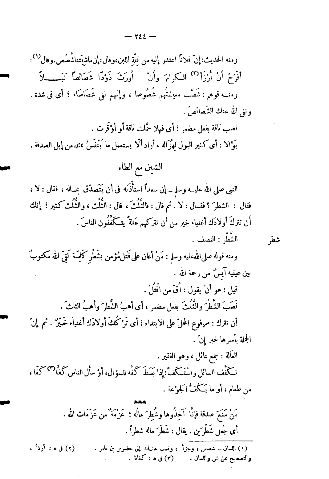 شطر الشّطْر: النّصْف. وَمِنْه قَوْله صلى الله عَلَيْهِ وَسلم: من أعَان على قتل مُؤمن بِشَطْر كلمة لَقِي الله مَكْتُوب بَين عَيْنَيْهِ آيس من رَحْمَة الله. قيل: هُوَ أَن يَقُول: اق من اقْتُل. نصب الشّطْر وَالثلث بِفعل مُضْمر أَي أهب الشّطْر وَأهب الثُّلُث. أَن تتْرك: مَرْفُوع الْمحل على الِابْتِدَاء أَي تَركك أولادك أَغْنِيَاء خير. ثمَّ إِن الْجُمْلَة بأسرها خبر إِن. العالة: جمع عائل وَهُوَ الْفَقِير. تكفف السَّائِل واستكف: إذابسط كَفه للسؤال أَو سَأَلَ النَّاس كفَّا كفّا من طَعَام أَو مَا يكف الجوعة. من منع صَدَقَة فَإنَّا آخِذُوهَا وَشطر مَاله عَزمَة من عَزمَات الله. أَي جعل شطرين. يُقَال: شطر مَاله شطراً.